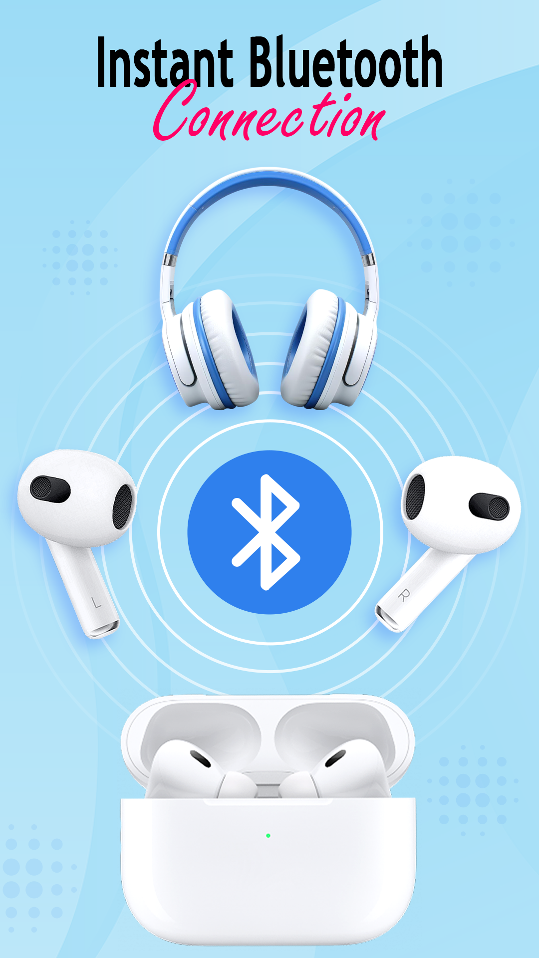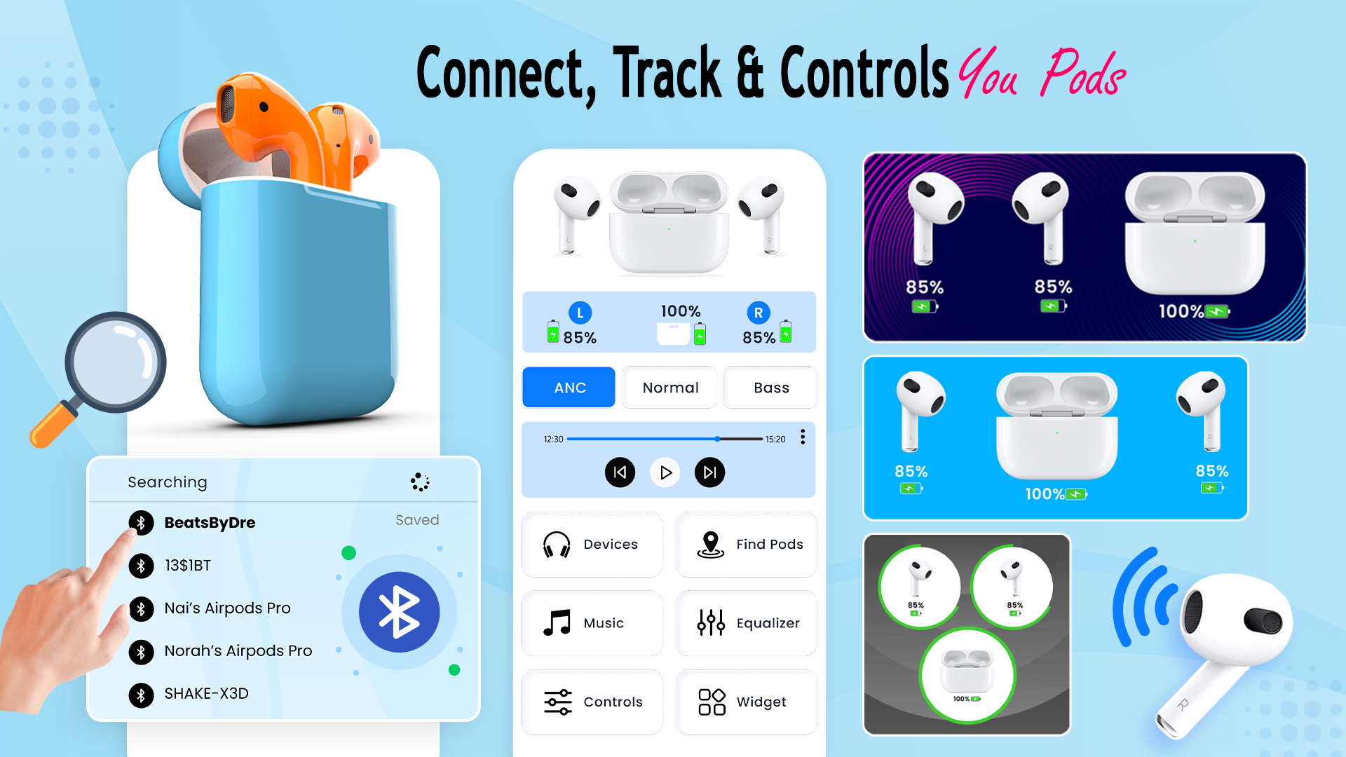 Airpod Finder: Connect & Track app is the ultimate Android companion for your AirPods. Connect, track, and manage all AirPods models, including Pro, Max, and 4th Gen, with features like "find my AirPods," battery monitoring, music, control, tracker, equalizer and custom widgets.