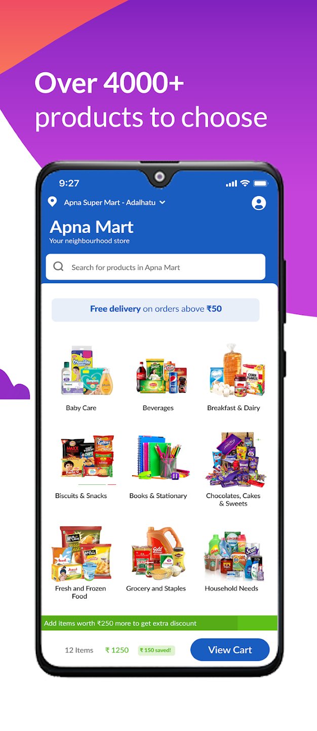 Apna Mart is an online grocery delivery app, which delivers all the daily essentials, meats, dairy products at your dorrstep within 30 minutes of placing the order from the nearby Apna Mart Supermarket in Ranchi (Jharkhand).