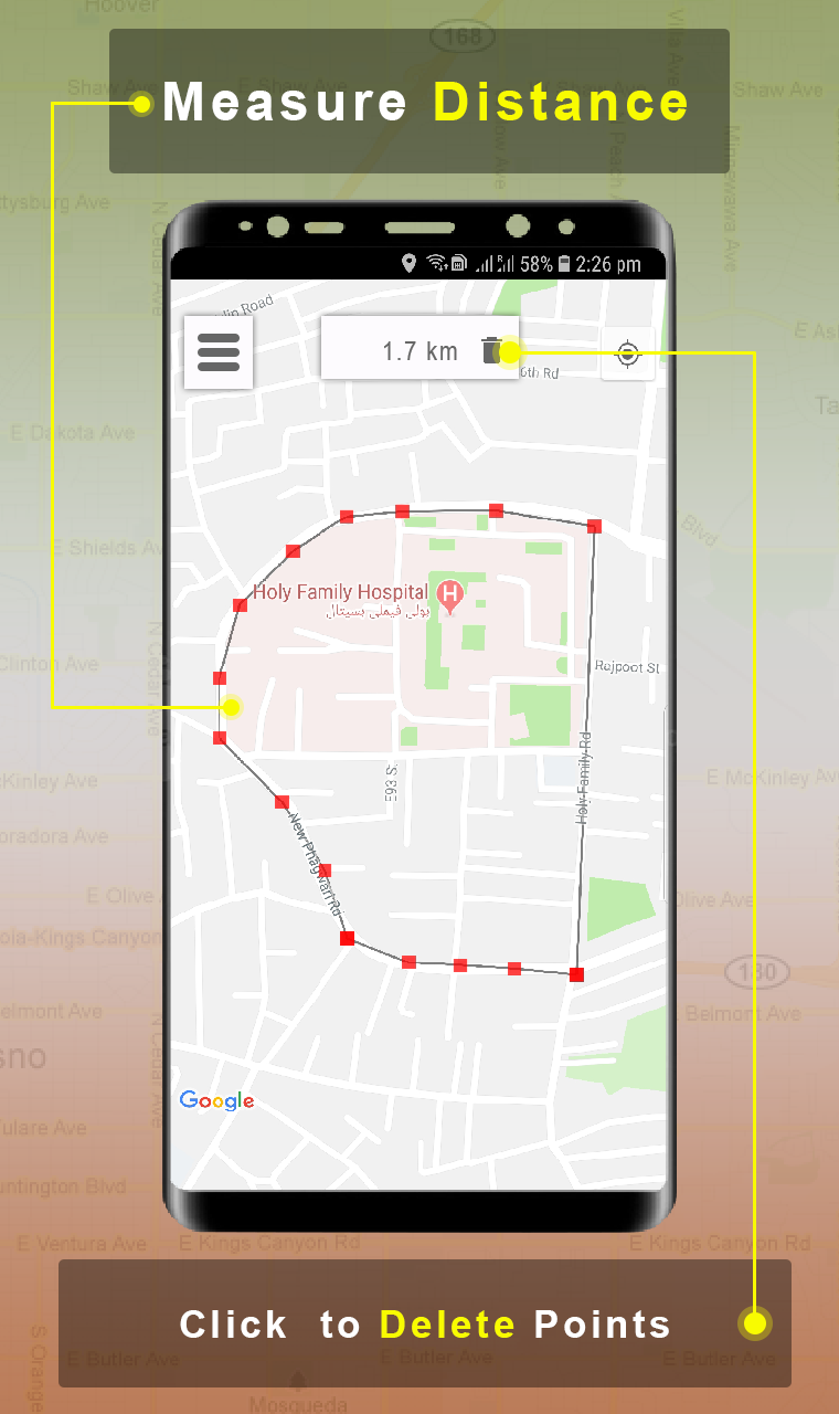 Gps area Measurement enables you to find route between two points on Gps map or planimeter. You can search your start point and End point as well. Select your points and just make a click on navigation icon and you are able to find shortest Distance between two points its works as Distance Calculator app.