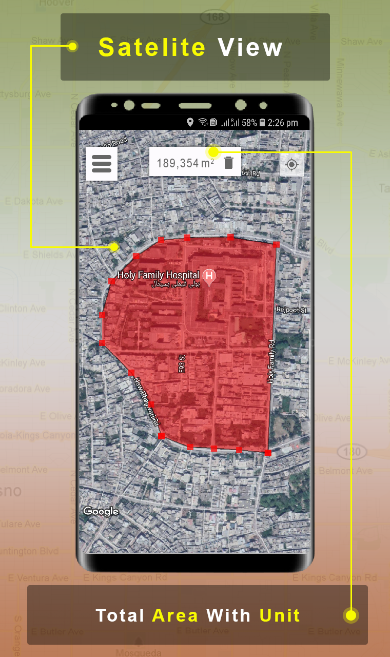 Distance and area measurement App has different types of view in built in form Satellite View, Terrine View, Hybrid view. Gps Field Area Measure is being used for multi purposes. Calculate the area for Dam and for Farm Fencing with Gps land Measurement. Players can also Track their Route distance.