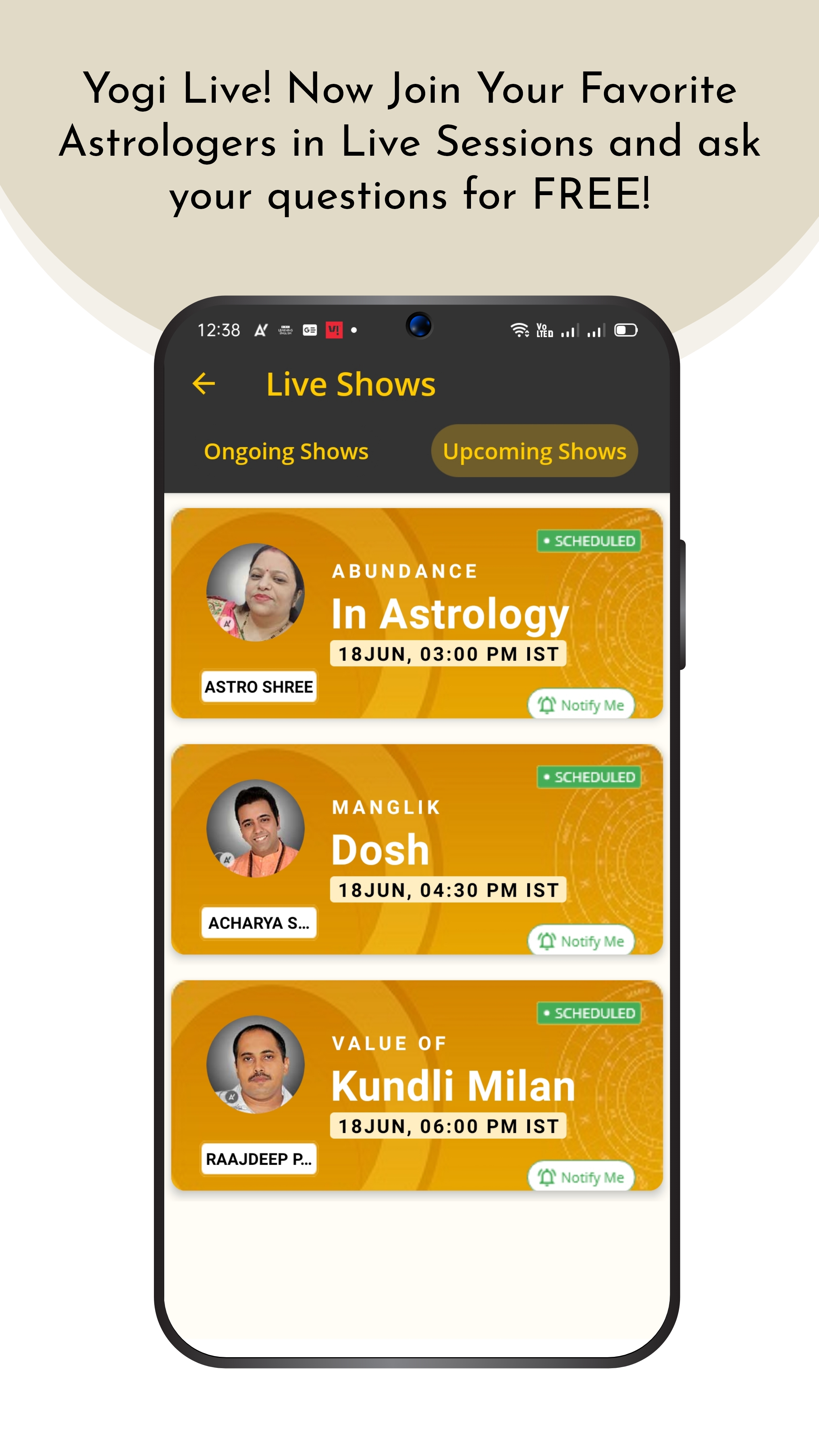 Now, join free live VIDEO sessions with India’s best Astrologers, Tarot Readers, Numerologists and Vastu experts and chat with them on Yogi Live! Looking for the right solutions to overcome your life's problems? Fret Not! Yogi Live brings you a wonderful opportunity to ask your questions live for free and get on-the-spot answers from your favourite experts.