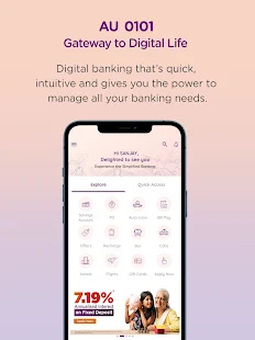 AU 0101 App is the result of our vision for secure and intuitive digital banking that is meant to be convenient, flexible and customer-focused to transform the way you bank. You can now manage your A/c, Book Fixed Deposit, raise service requests over Video Call, Transfer funds, apply for a Car / Personal Loan, invest in IPO / Mutual Funds etc., Make UPI payments, set up bill payments, book a cab / bus / flight and much more.