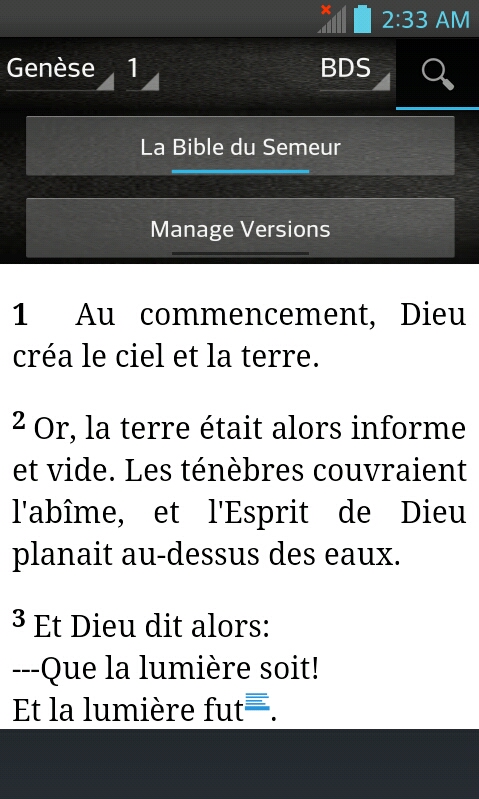 ✝ Vous pouvez télécharger la version de la Bible que vous voulez et dans la langue qui vous intéresse, il suffit d'aller dans le menu et choisissez Gérer les versions.