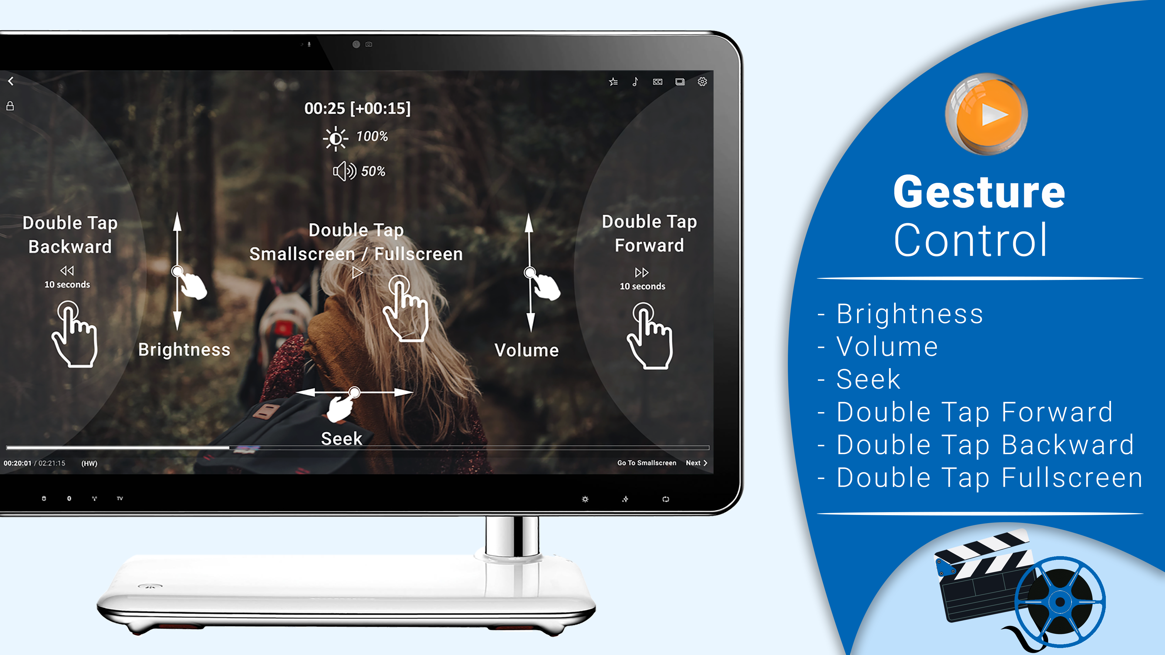 9. GESTURE CONTROLS: Natural, easy-to-use multiple gesture controls like volume, brightness, double tap fast forward, double tap rewind and seek make playback a breeze.