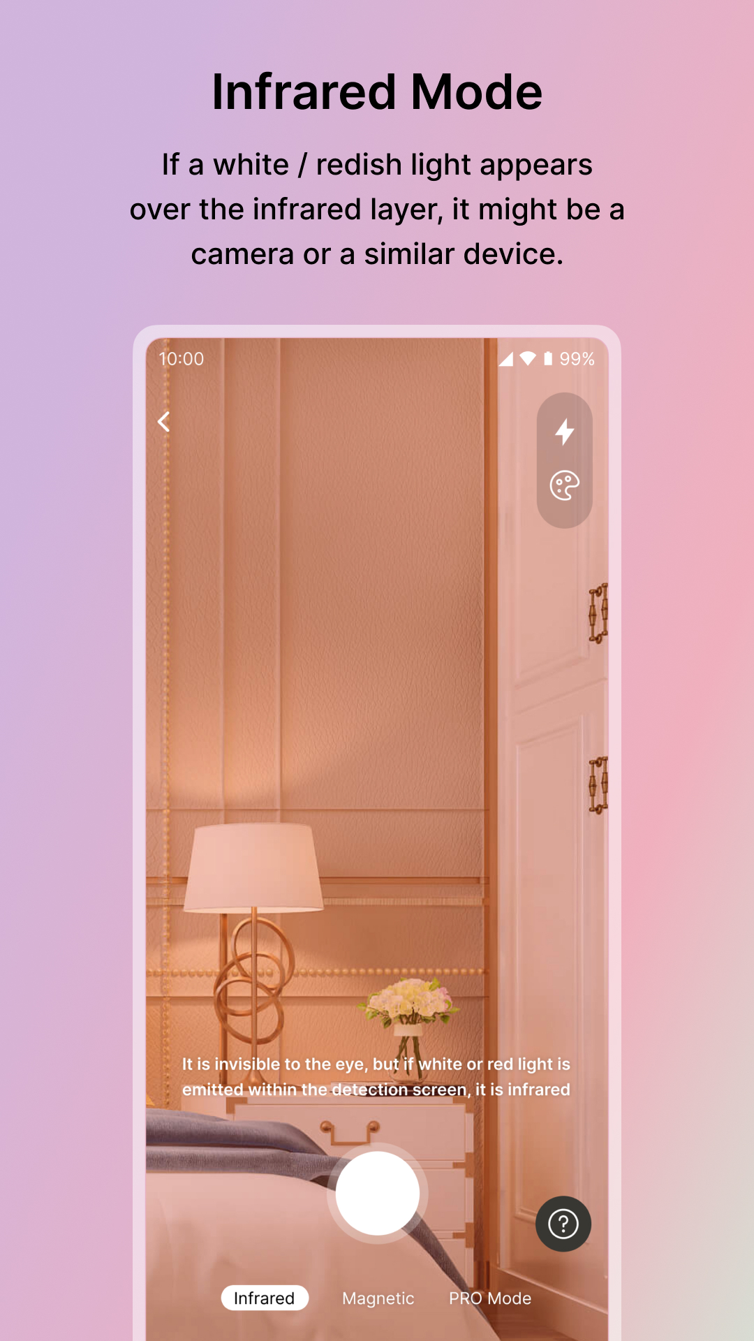 Protect your privacy instantly with DETEKCAM, the top spy camera detector app. Scan hotel rooms, Airbnb rentals, offices, dorms, and any space where privacy matters. Detect hidden cameras, nanny cams, pinhole cameras, and covert surveillance devices in seconds using AI-powered detection and infrared scanning. Stay secure anywhere you go!