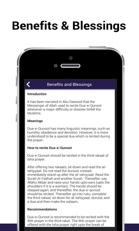 • Full audio recitation of the Dua-e-Qunoot with pause and stop options