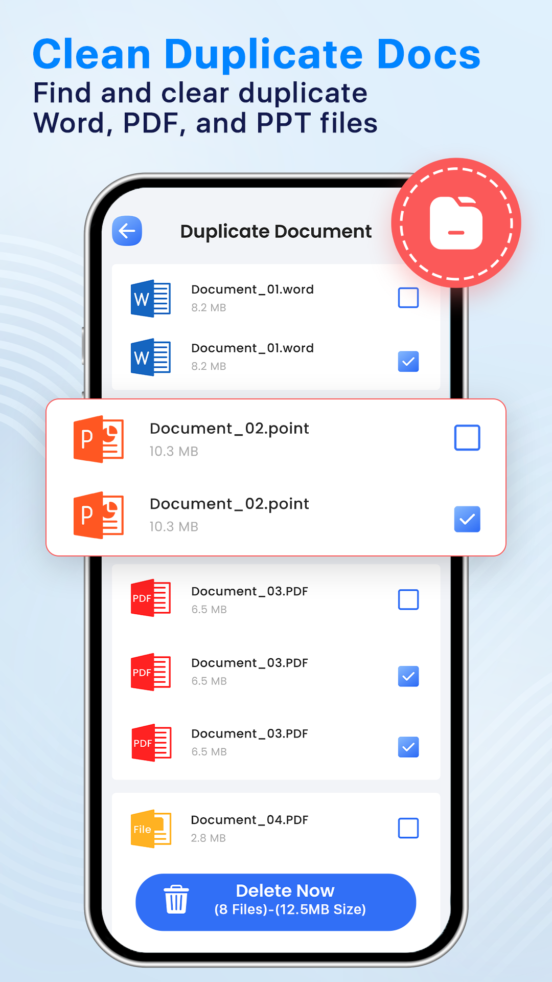 The app scans for repeated PDFs, text files, and other documents. It groups matching documents together, allowing you to keep only the ones you need.
