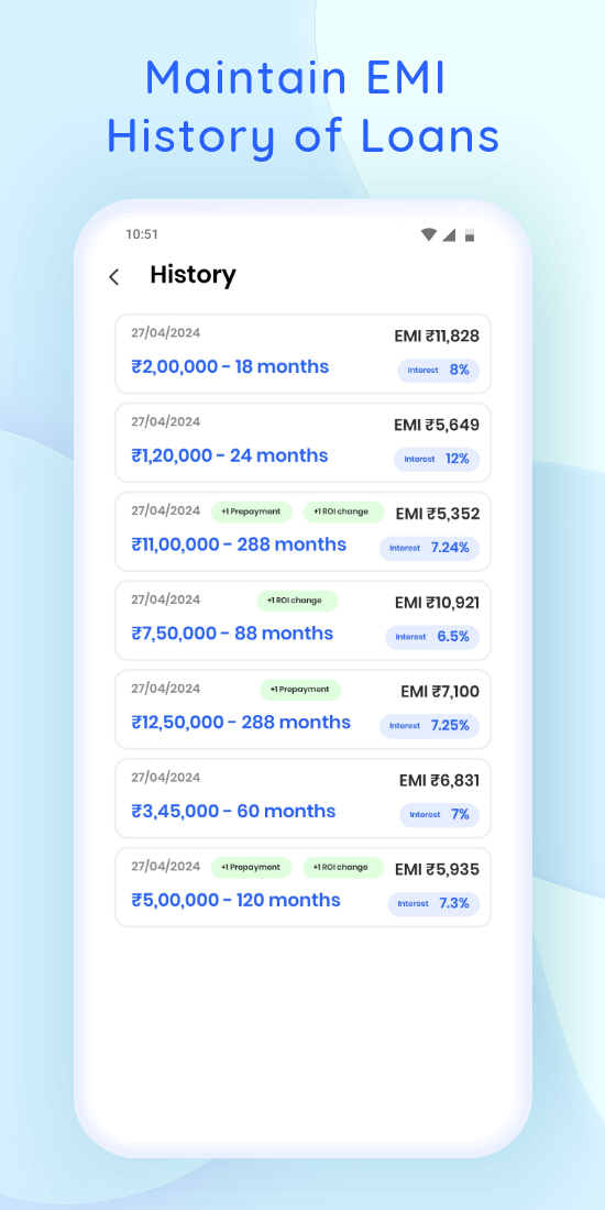~ Maintain the EMI History of different types of Loans, edit them(whenever required) and keep a trace on all loan details.