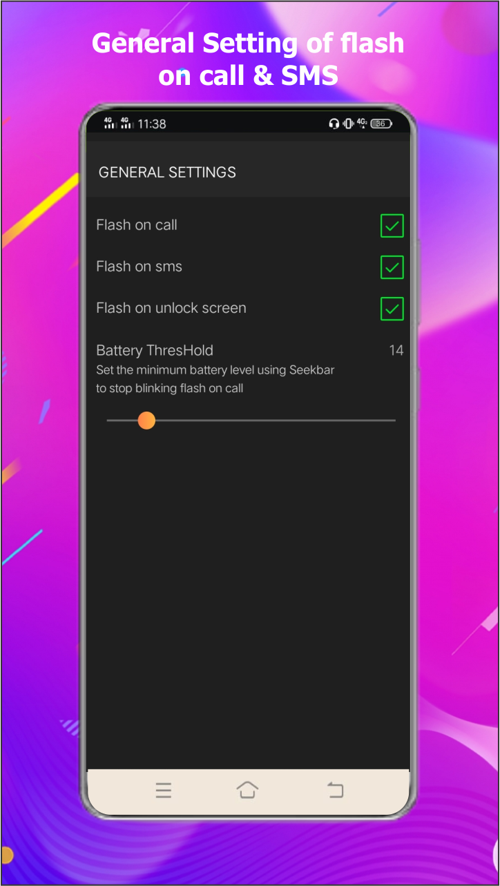 Whenever a call or SMS is received on your phone, the flash alerts will be triggered informing you about it. With customization settings, you can set the blink interval of the flash light according to you requirements. Now, you will never miss an important message or call as Flash on call and SMS app will inform you about it on time.