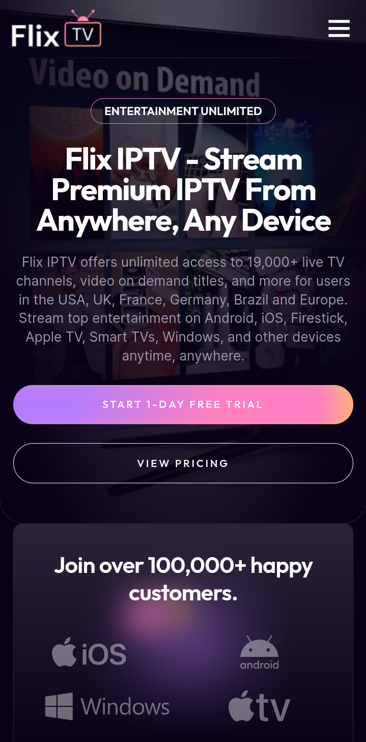 Flix IPTV was founded in 2018 by a team of home entertainment enthusiasts looking to provide exceptional IPTV services to customers around the world. We specialize in curating and delivering reliable streams for live television, video-on-demand catalogs, and worldwide content to any internet-connected device.
