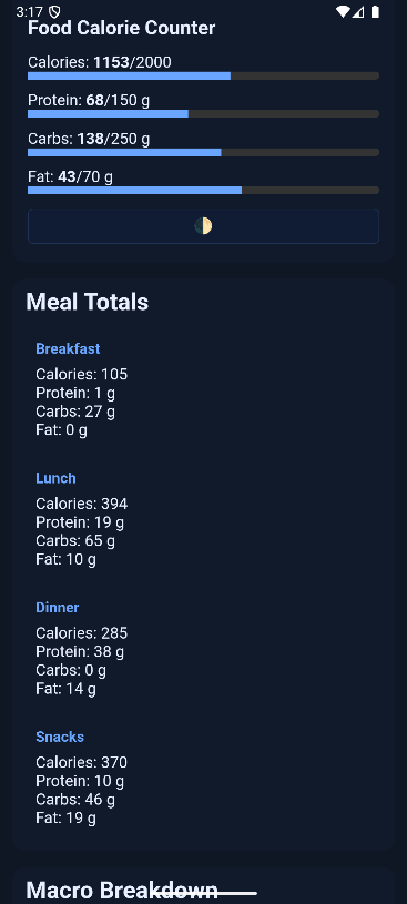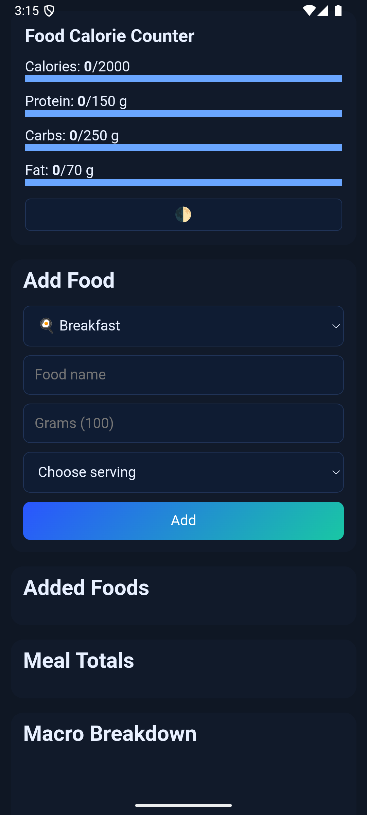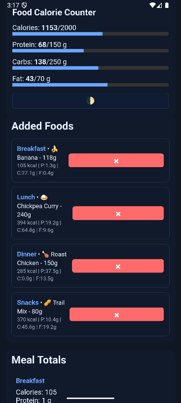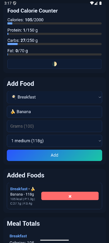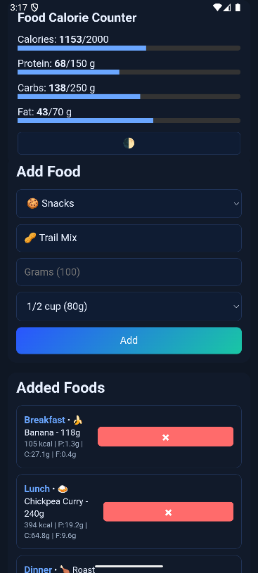 Food Calorie Counter helps you quickly check calories, protein, carbs, and fat for your meals. Choose from breakfast, lunch, dinner, and snack options.