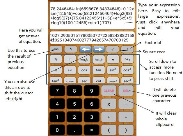 This scientific calculator is made to make editing of large expressions easy. I have faced situation in my engineering where I have to write large expressions with little changes again and again. So I made this scientific calculator where you can easily edit and write large expressions. One more great feature of this scientific calculator is that you can deal with large numbers i.e. you can even calculate Factorial of 5000. One more thing you don't need to press shift this will save lot of time.