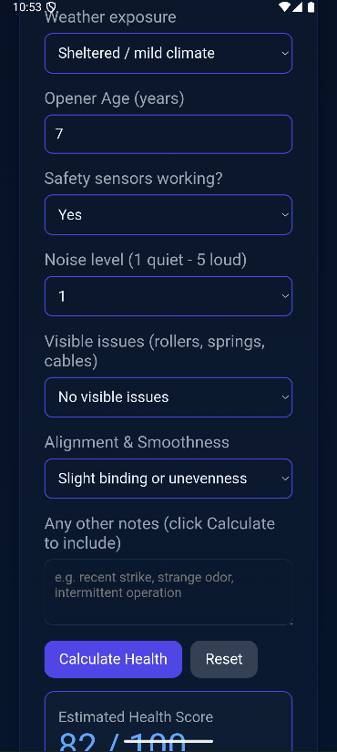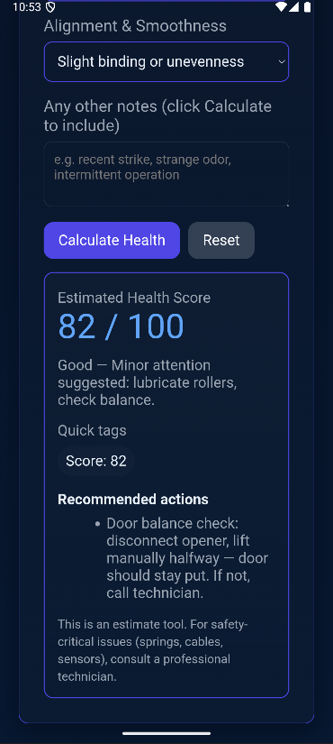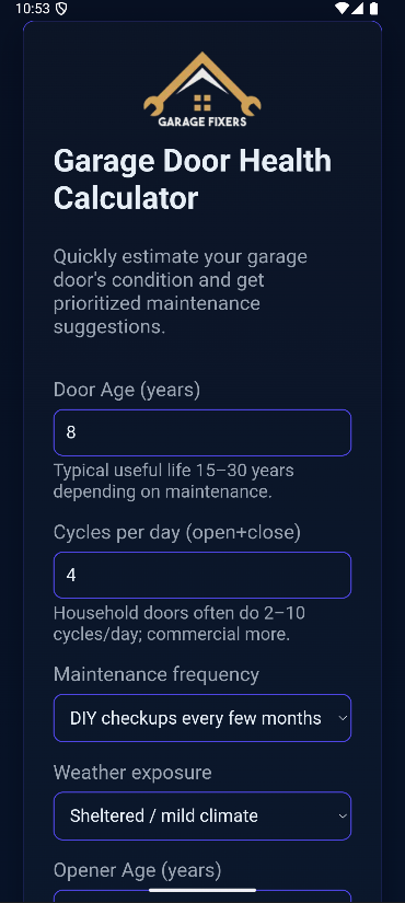 Garage Door Health Calculator helps you quickly check your garage door’s condition, estimate its health score, and get simple maintenance tips for smoother, safer operation.