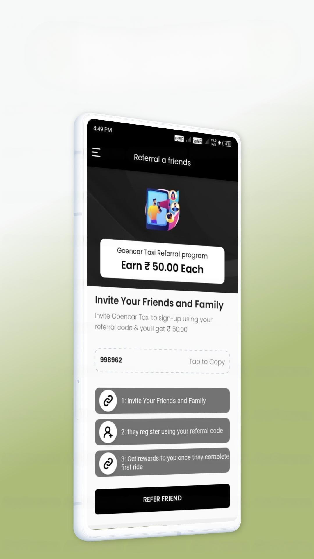 Download the App: Search for the “Goencar Taxi” in Google Play Store and install the app for free.