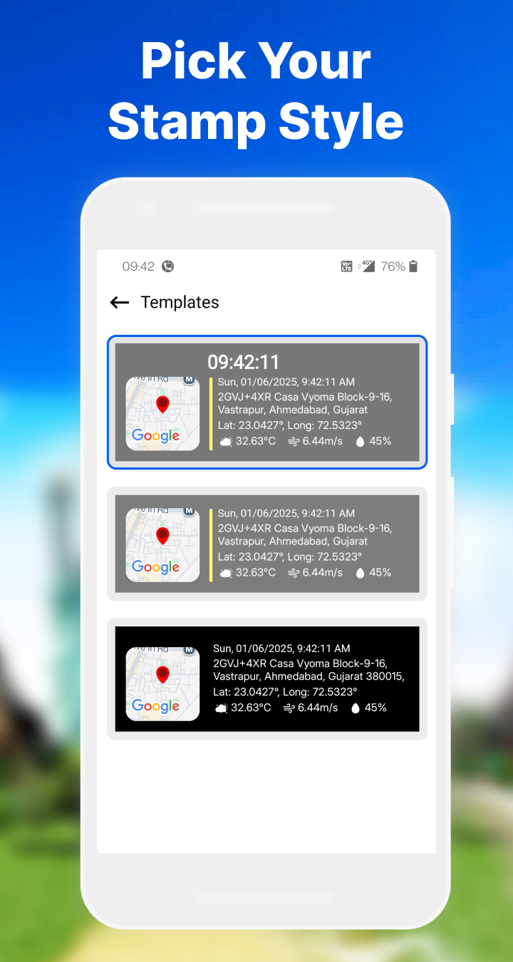 ➜ Multiple Template Option: Geotagging camera with various types of unique templates.