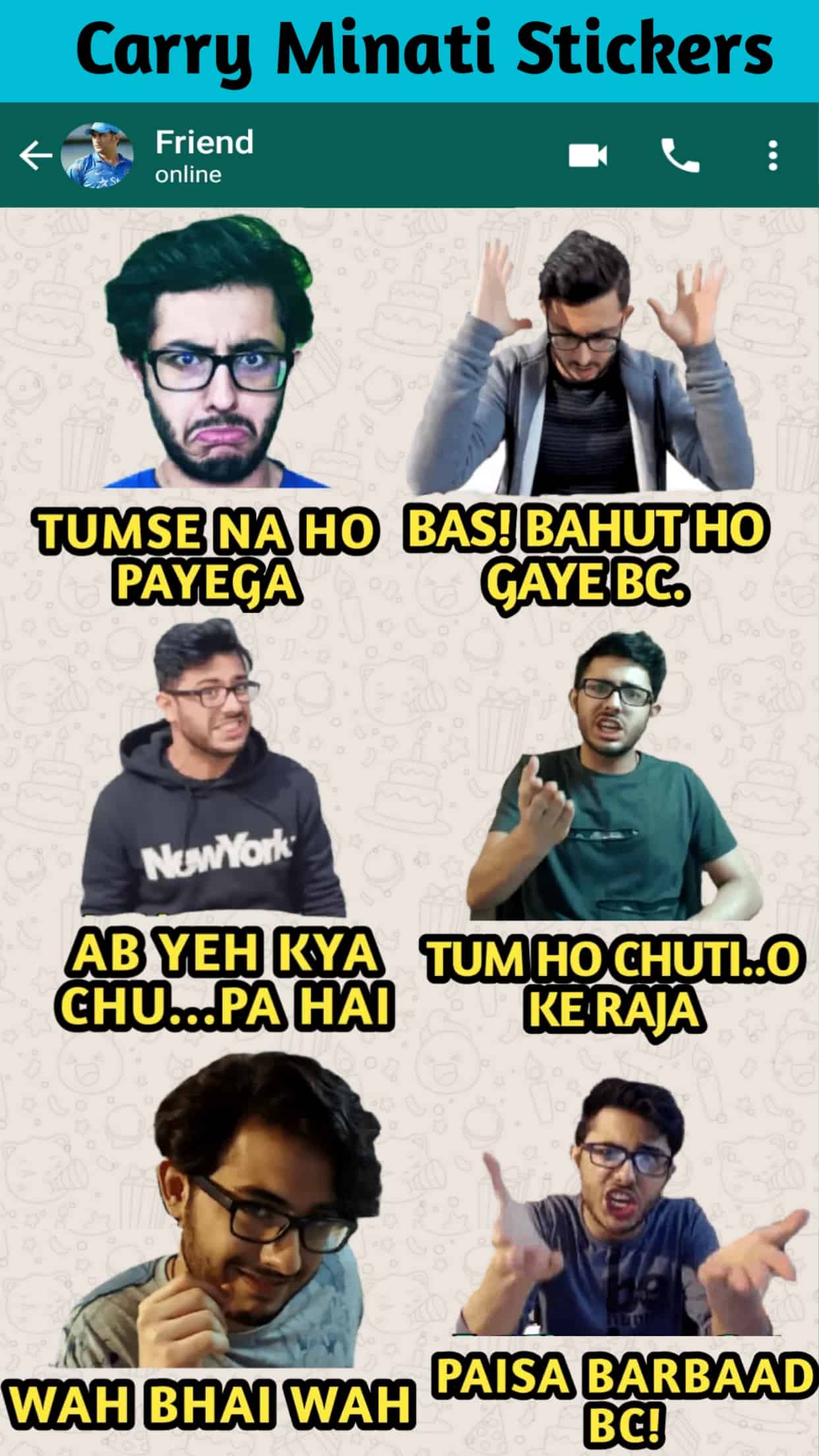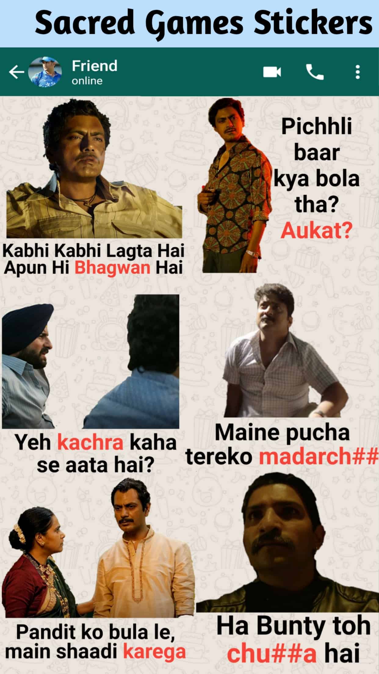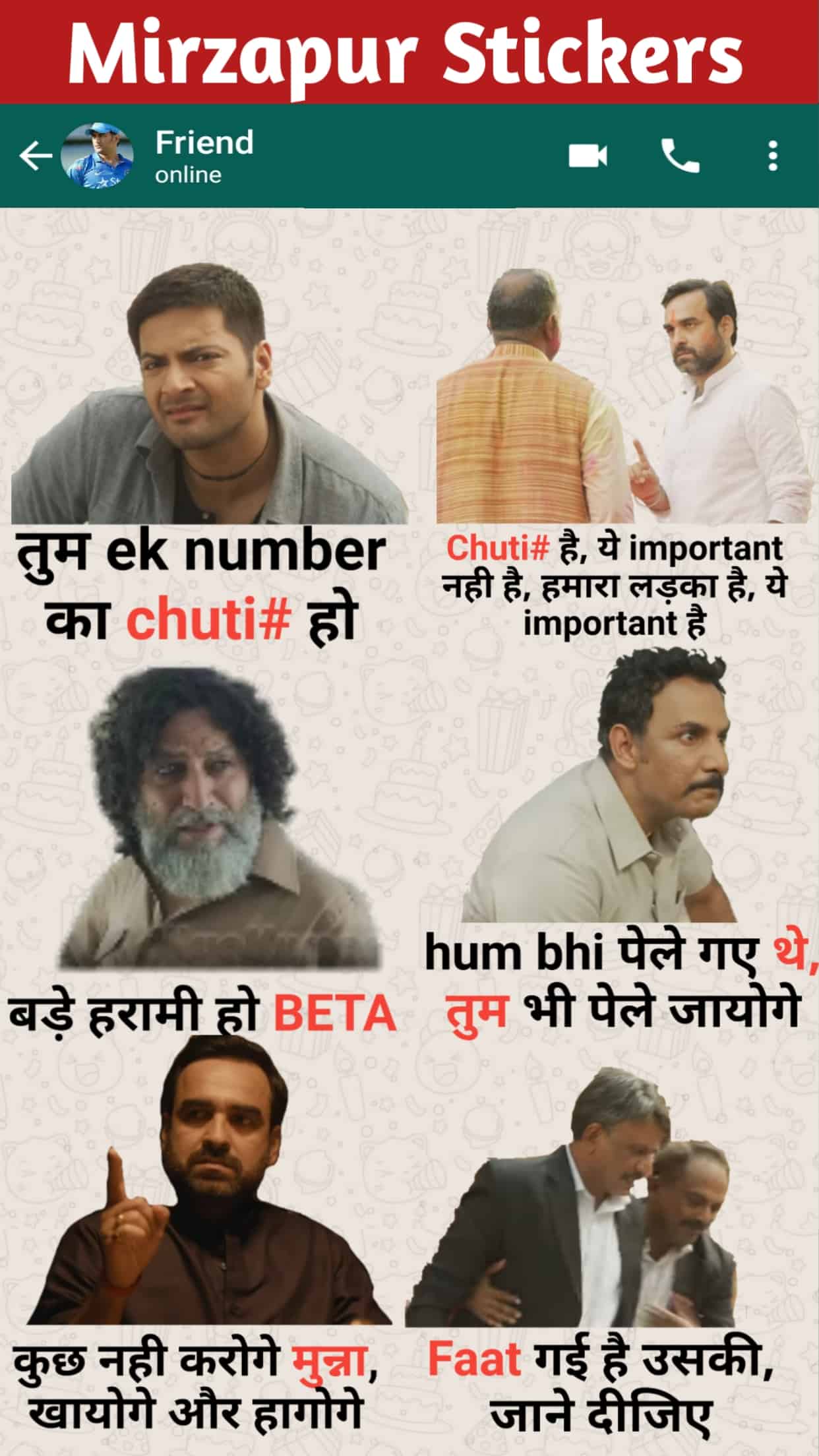 In our Hindi Stickers App for WhatsApp, you will get all trending stickers in Hindi including Mirzapur, Carry Minati, Hindustani Bhau, Sacred Games, Abbey Saale, and many other categories.