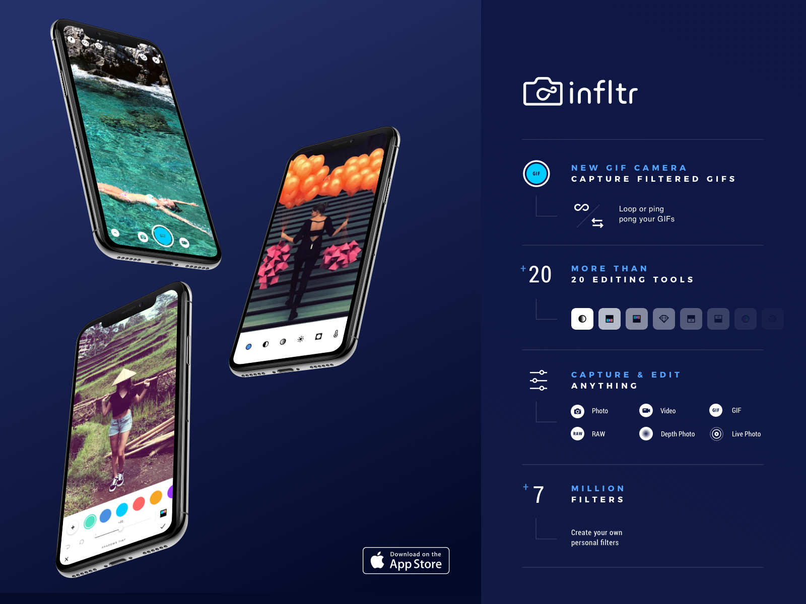 Named Editors Choice and Best New App by Apple in over 150 countries, infltr is a new type of photography App available on the App Store worldwide in 22 different languages for iPhone & iPad (iOS 9.0 and above), iMessage and Apple Watch (watchOS 3.0 and above). Earlier this year, infltr won a Creativepool Annual 2017 Award.