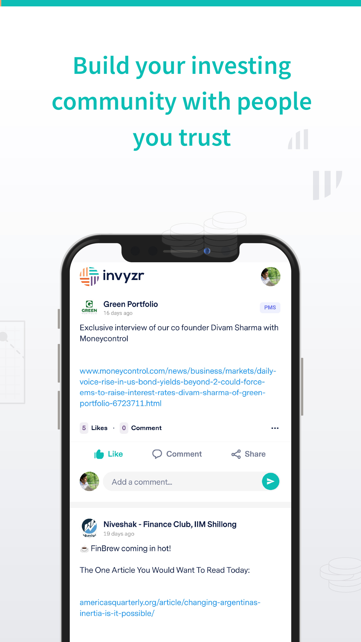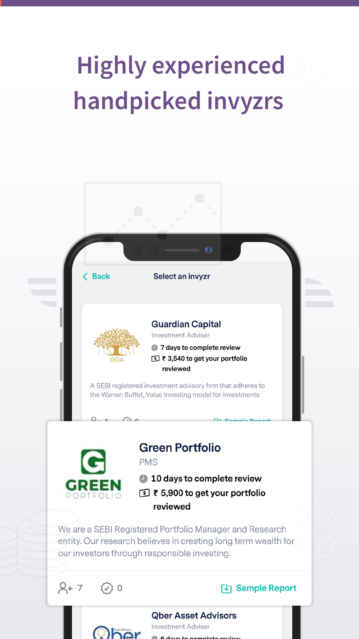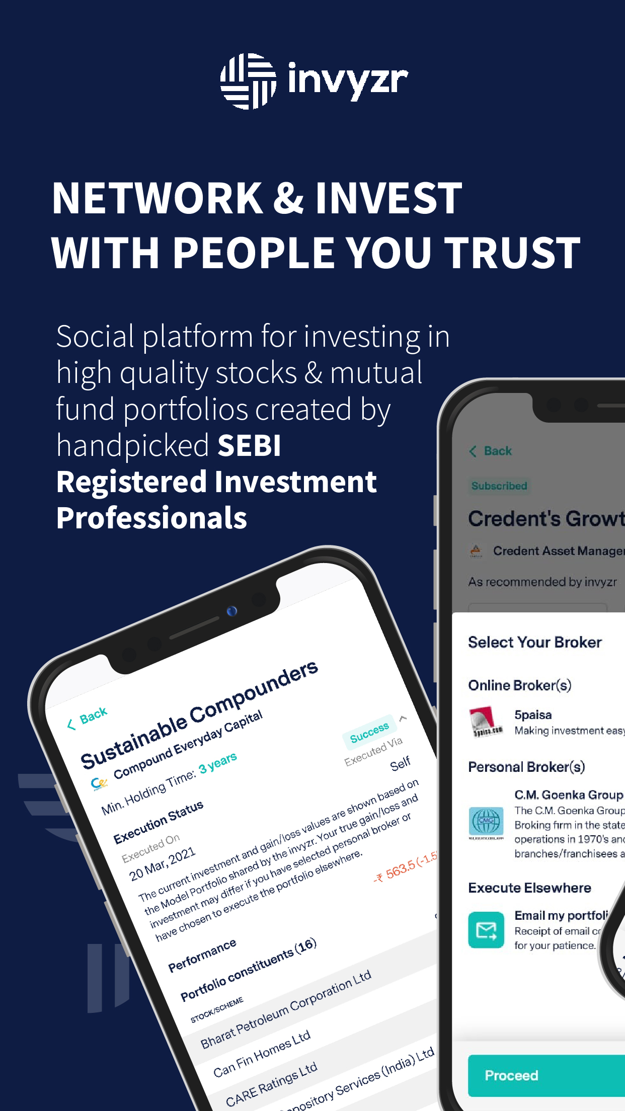 invyzr app is a social investing platform that helps you move away from Do-It-Yourself investing to professionally guided investing with help from high-quality SEBI registered investment professionals (called invyzrs). invyzr app provides retail investors with access to investment management service that is otherwise available only to the wealthy investors.