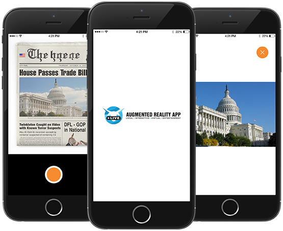 Live AR News mobile app is used with a website, a photo in an article is scanned with the camera of a mobile device. The AR software identifies the photo and then loads related digital content. Content is displayed in the device's camera view.