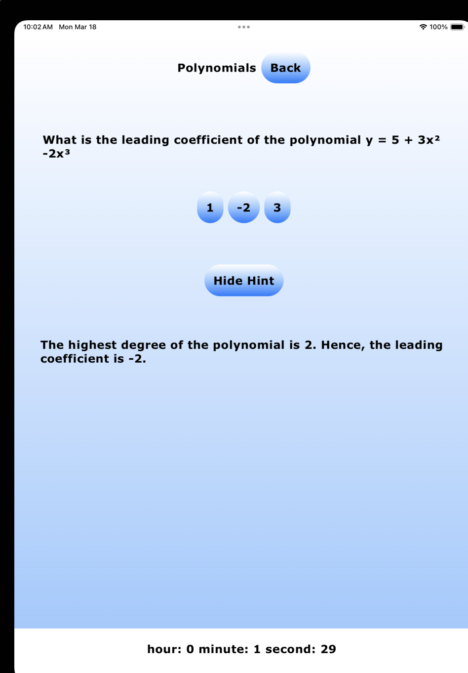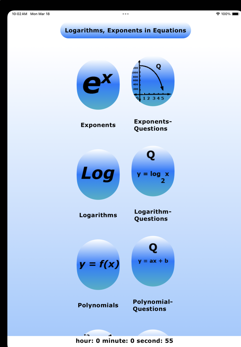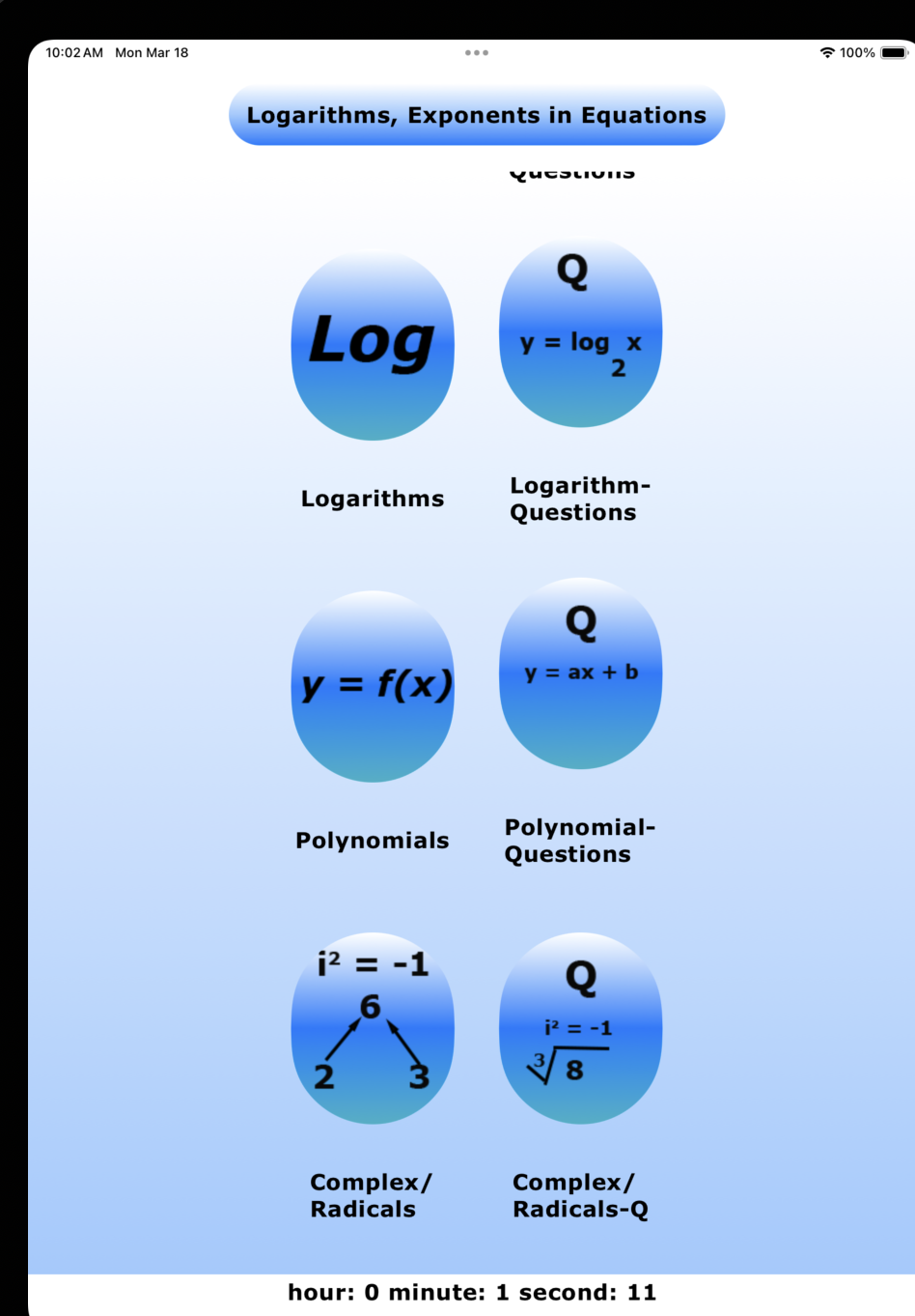 "Logarithm-Exponent-Polynomial" is an educational and a reference app which describes important concepts in Algebra. As the name suggests, the app has explanation on Math Algebra - Logarithms, Exponents, Quadratics, Polynomials along with Radicals and Complex Numbers. The app also has problems with detailed explanation of hints for solving. The audio explains the concepts that enables the user to pause, or continue to listen.
