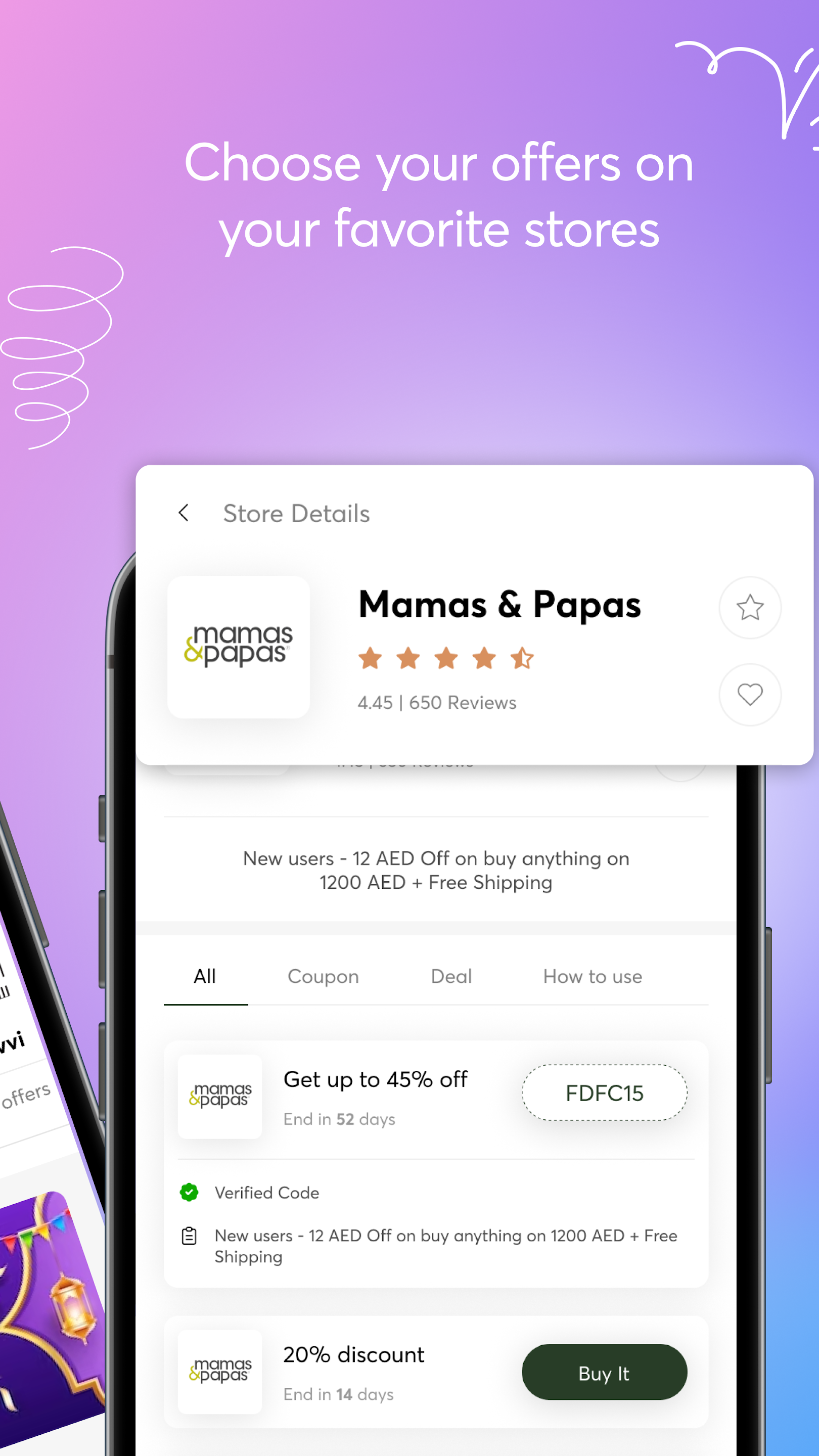 Our extensive list of partner stores includes popular brands like Noon, Namshi, Sivvi, Mamas & Papas, Mumz World, 6th Street, Noon Food, Careem Food, Now Now, Bath & Body Works, Ontime, AliExpress, PatPat, Banggood, Level Shoes, Fila, West Elm, Saramart, Ace, Danube Home, Fordeal, Daily Meals, Amazon, Ritual, Boots, and many more. We've got you covered for all your shopping needs!