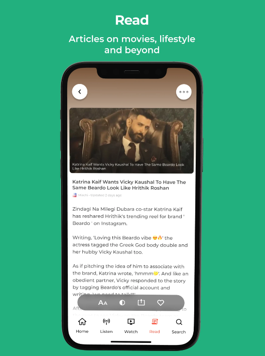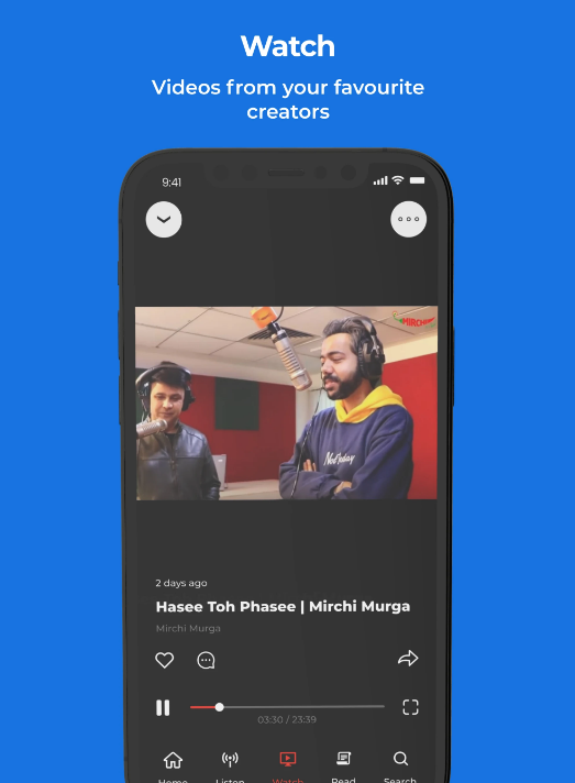Mirchi Plus App, speaks your language too. You can find audio and video content along with snackable articles in languages like Hindi, English, Marathi, Punjabi, Gujarati, Bangla, Telegu, Tamil, Malayalam, and Kannada as well.