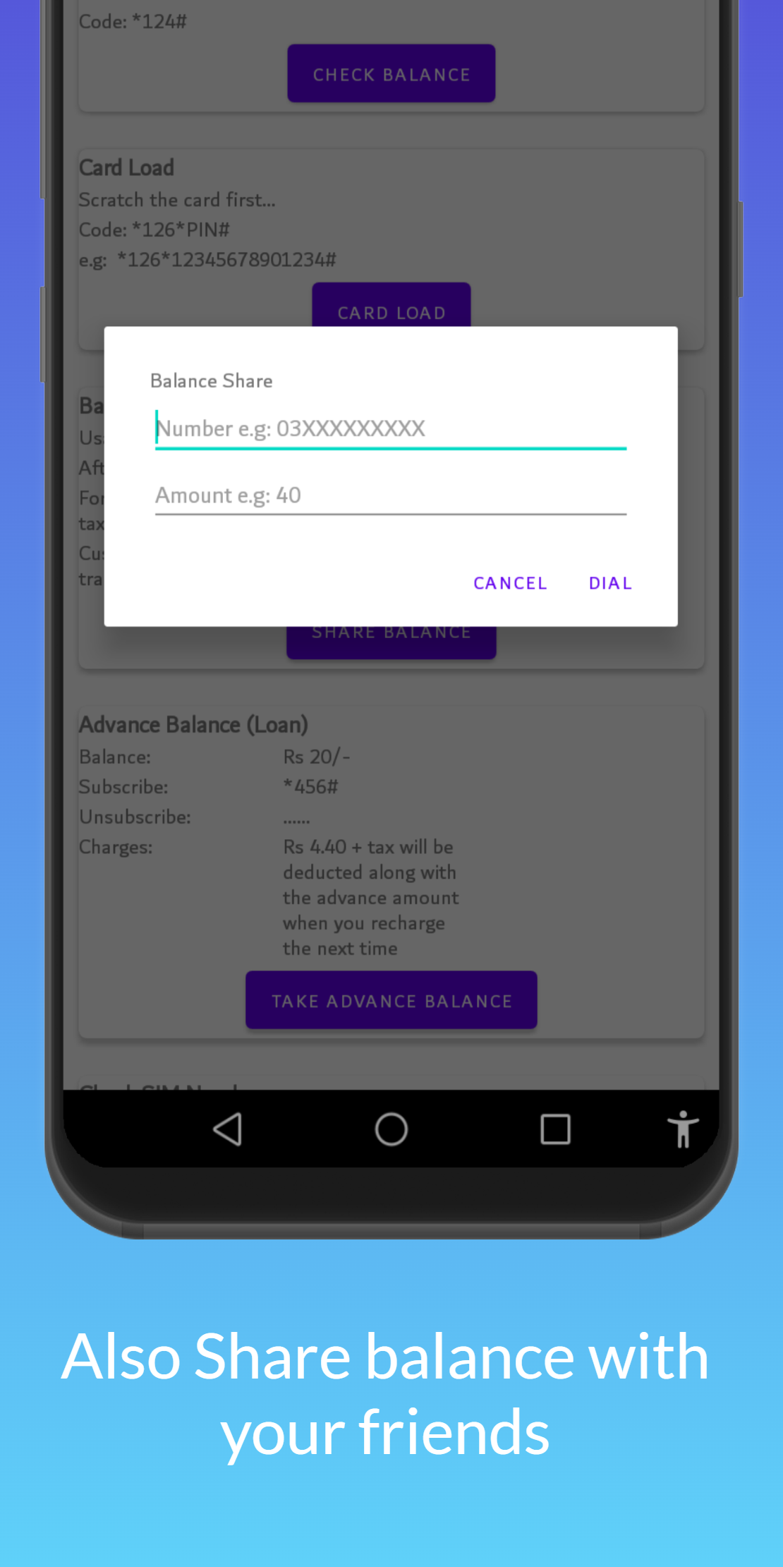 By the help of this Application, you can Share Balance at your fingertips, even you don’t need to remember codes for Balance sharing. You can share balance to listed Networks.