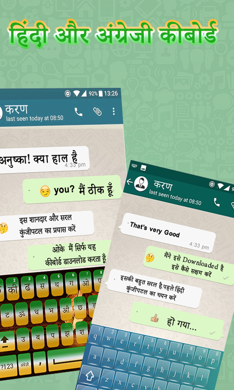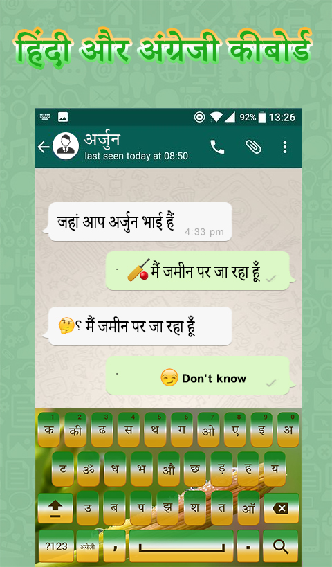 Now you can write Hindi keyboard font, text messages, words in any social media application like Whatsapp, Facebook, Twitter, Instagram, messenger, IMO, Viber and you can also write an email easily with this English Hindi simple typing app.Hindi emoji Keyboard very easy to use and user friendly interface.Update your fb Hindi status, whats app Hindi status with this Hindi translator keyboard.