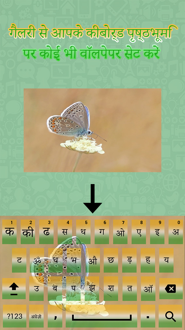 Add a picture as keyboard themes on your android mobile with Hindi to English Keyboard. You can also set your image and Indian flag as beautiful keyboard background pictures with this top free Hindi mobile keyboard.