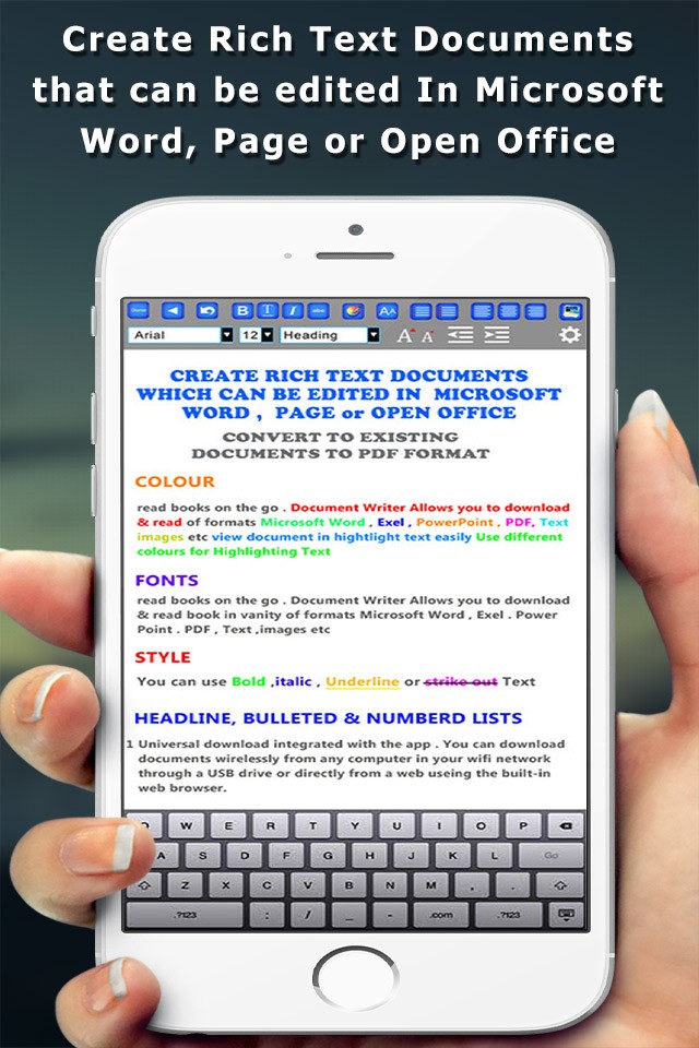 + Create documents in open standard html format which can be opened or edited in any standard word processor like Microsoft Office, Pages or Open Office.