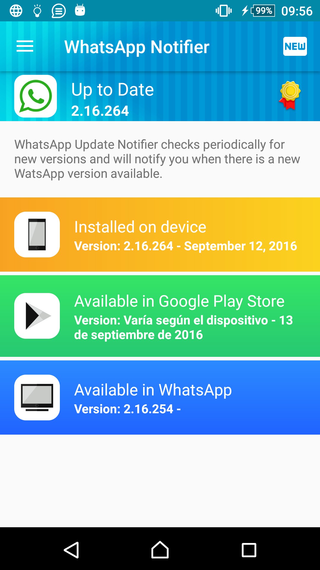WhatsApp Notifier periodically checks for new WhatsApp versions for you. Every time a new version is available it will notify you! It also include a WhatsApp's FAQ section and a bunch of WhatsApp addons. Don't hesitate, try it!
