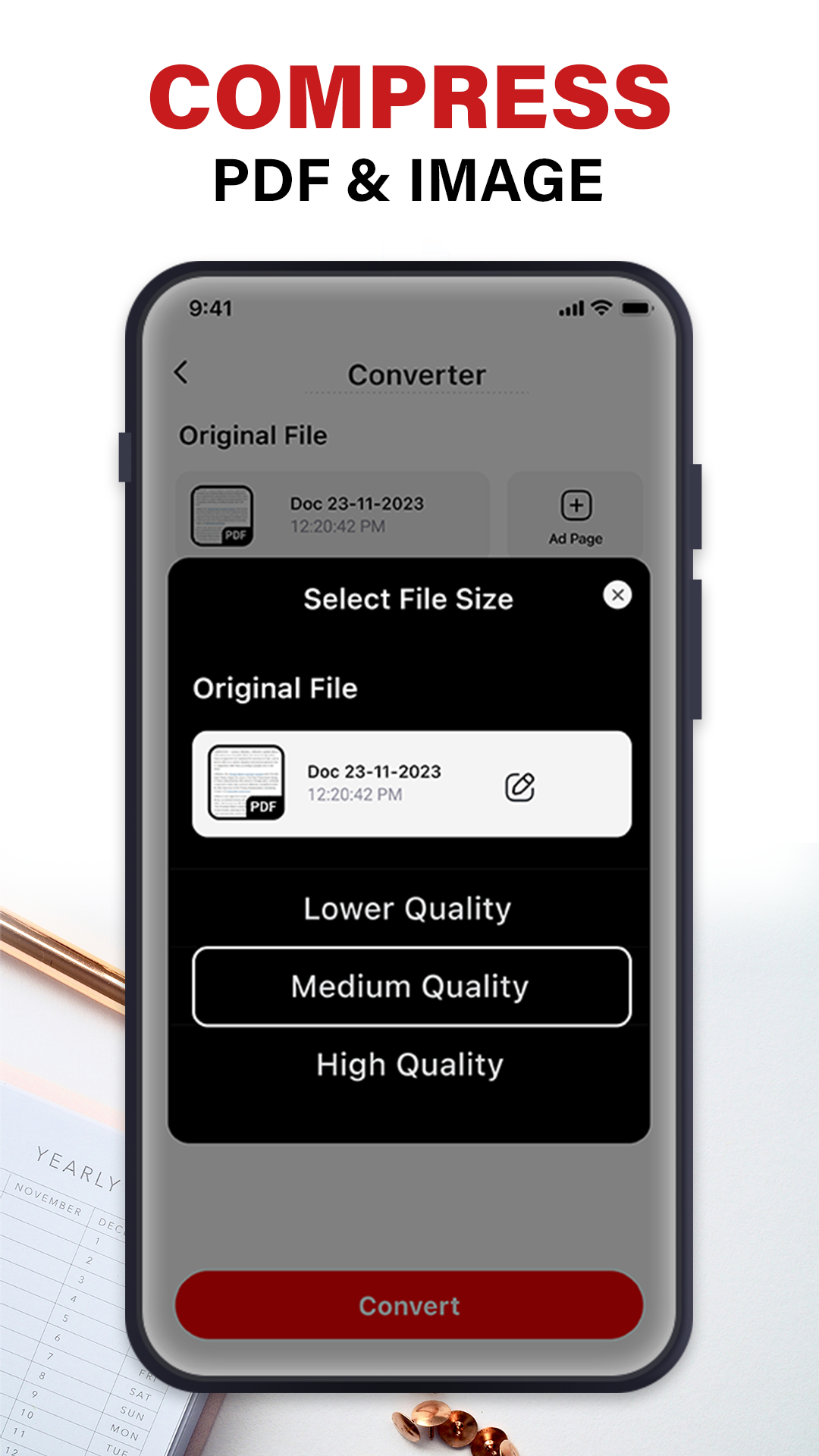 Choose high, medium, or low quality to reduce PDF size and save storage space.