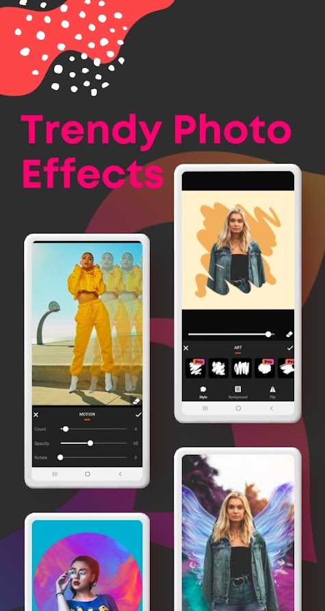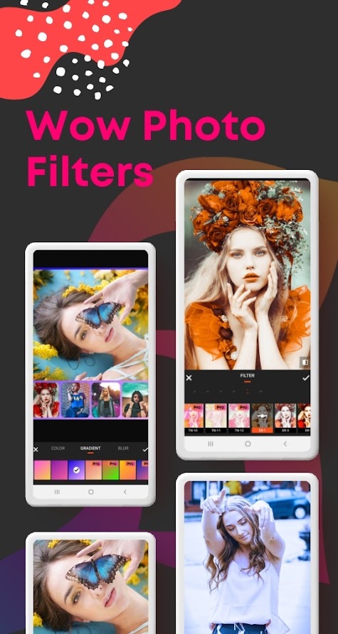 Using this photo editor app, you can adjust brightness, contrast, saturation, hue, warmth and add different types of filters on your photos. Choose your favorite ones from hundreds of filters and effects. Use overlay, stickers, beauty enhancers and more to make your images look more amazing.