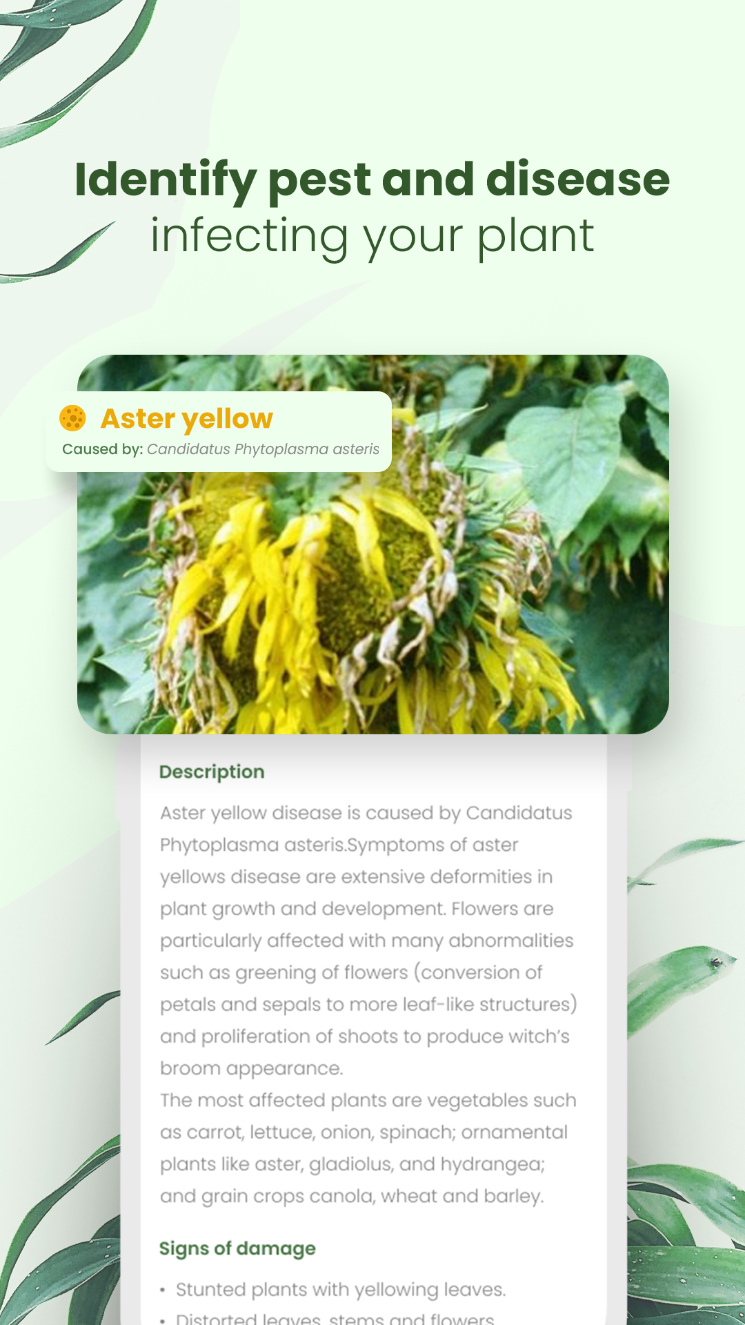 With the Plantora - plant identifier, you can find out any problems such - as deficiencies and diseases of your plant, and receive appropriate solutions to take better care of your plant.