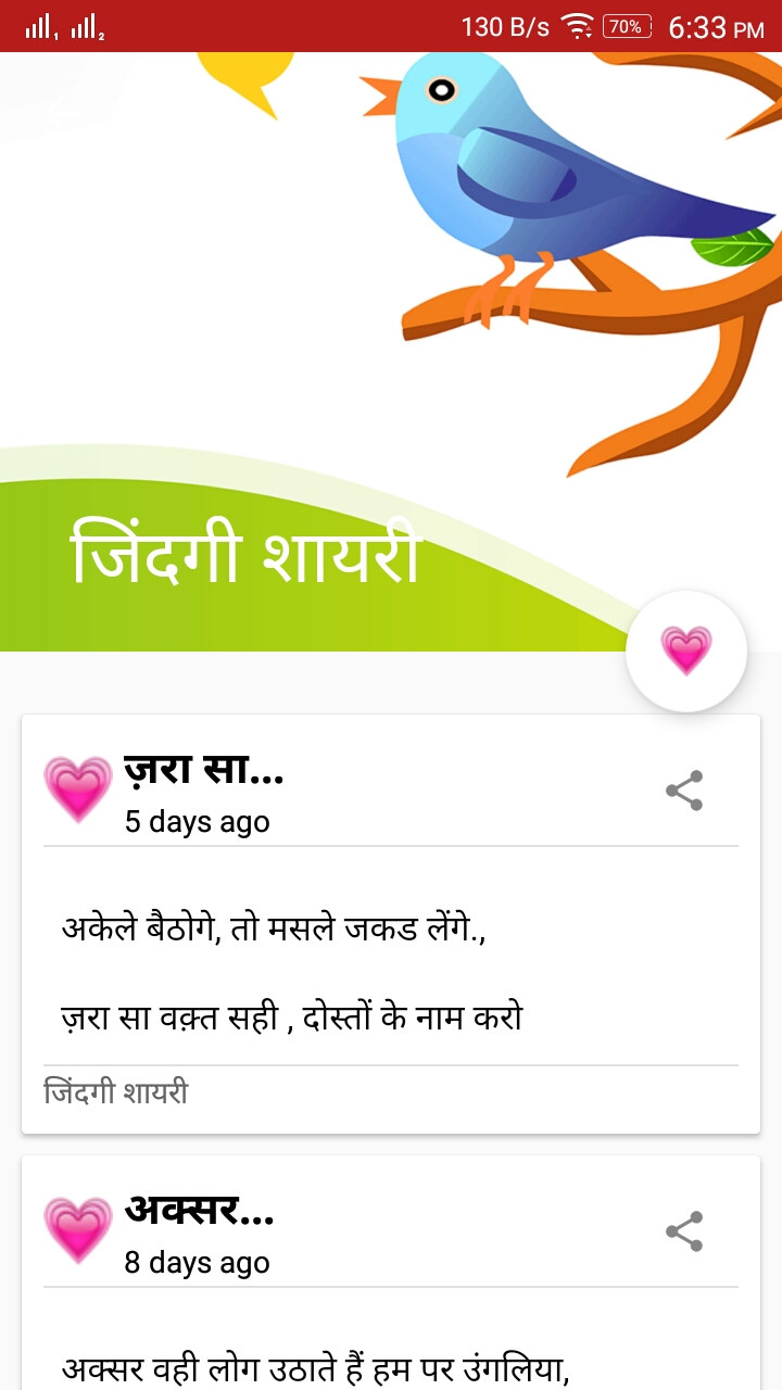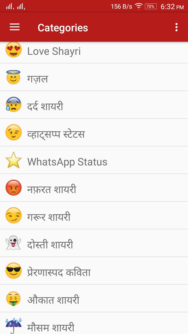 There are various categories like "Pyari Shayri","Hindi Shayri","English Shayri","Love Shayri" and much more.