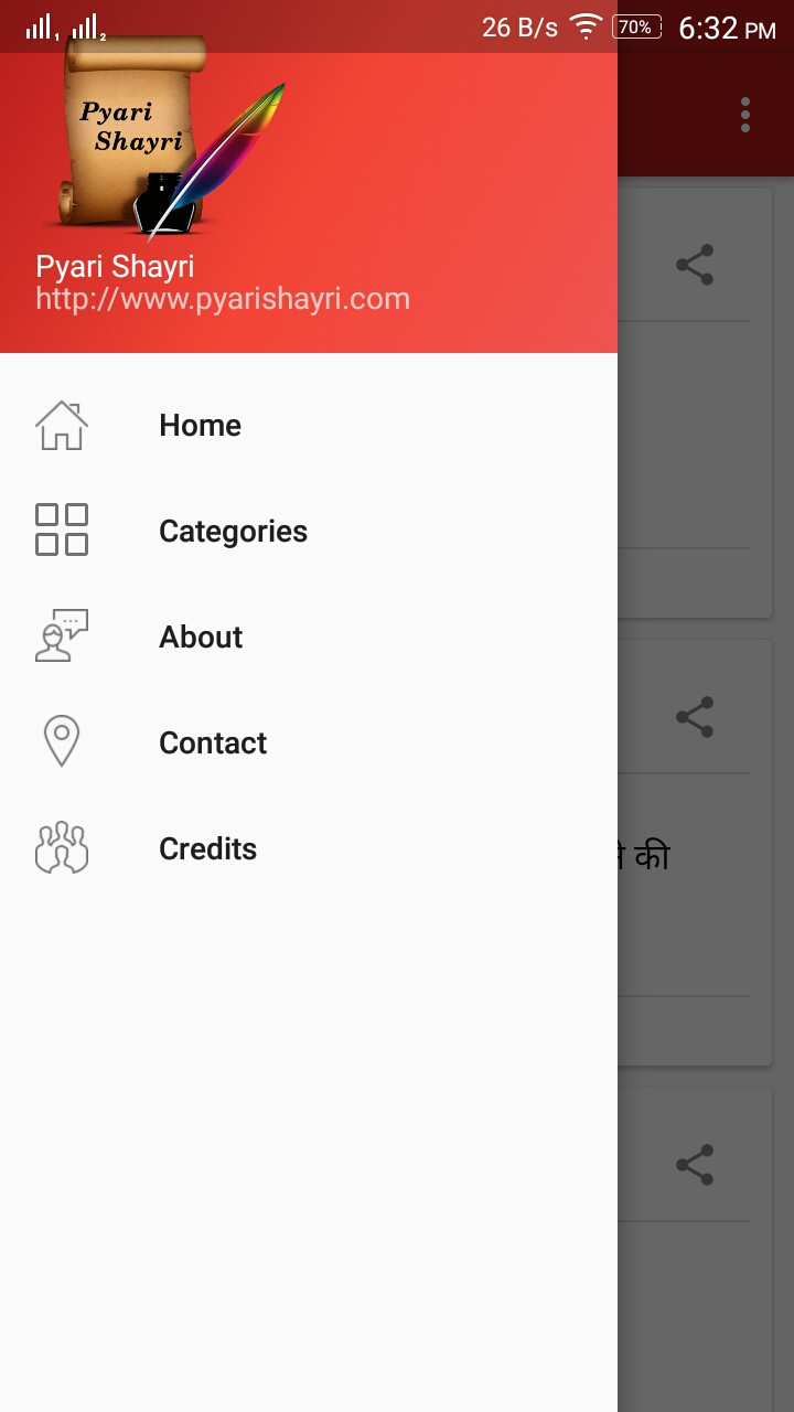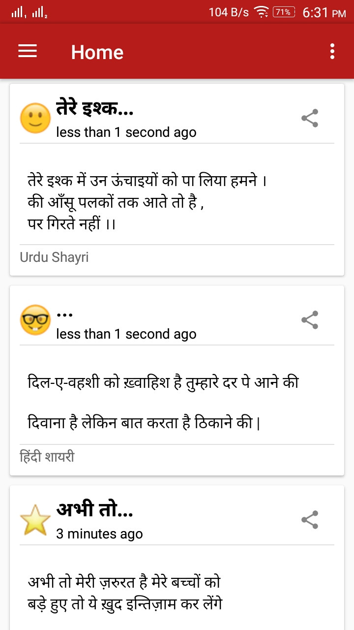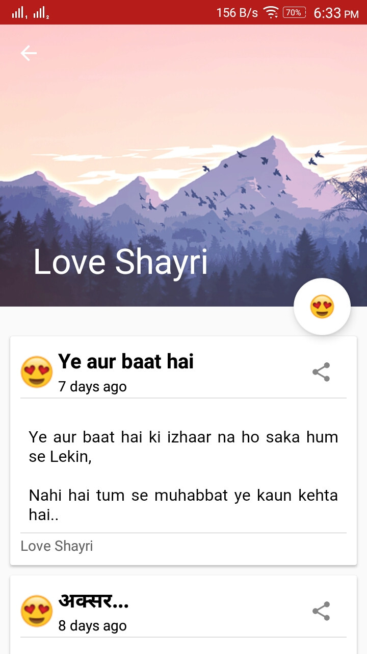 Pyari Shayri helps you to convey your thoughts and emotions by its share feature. You can share the shayri you love by various social media means.