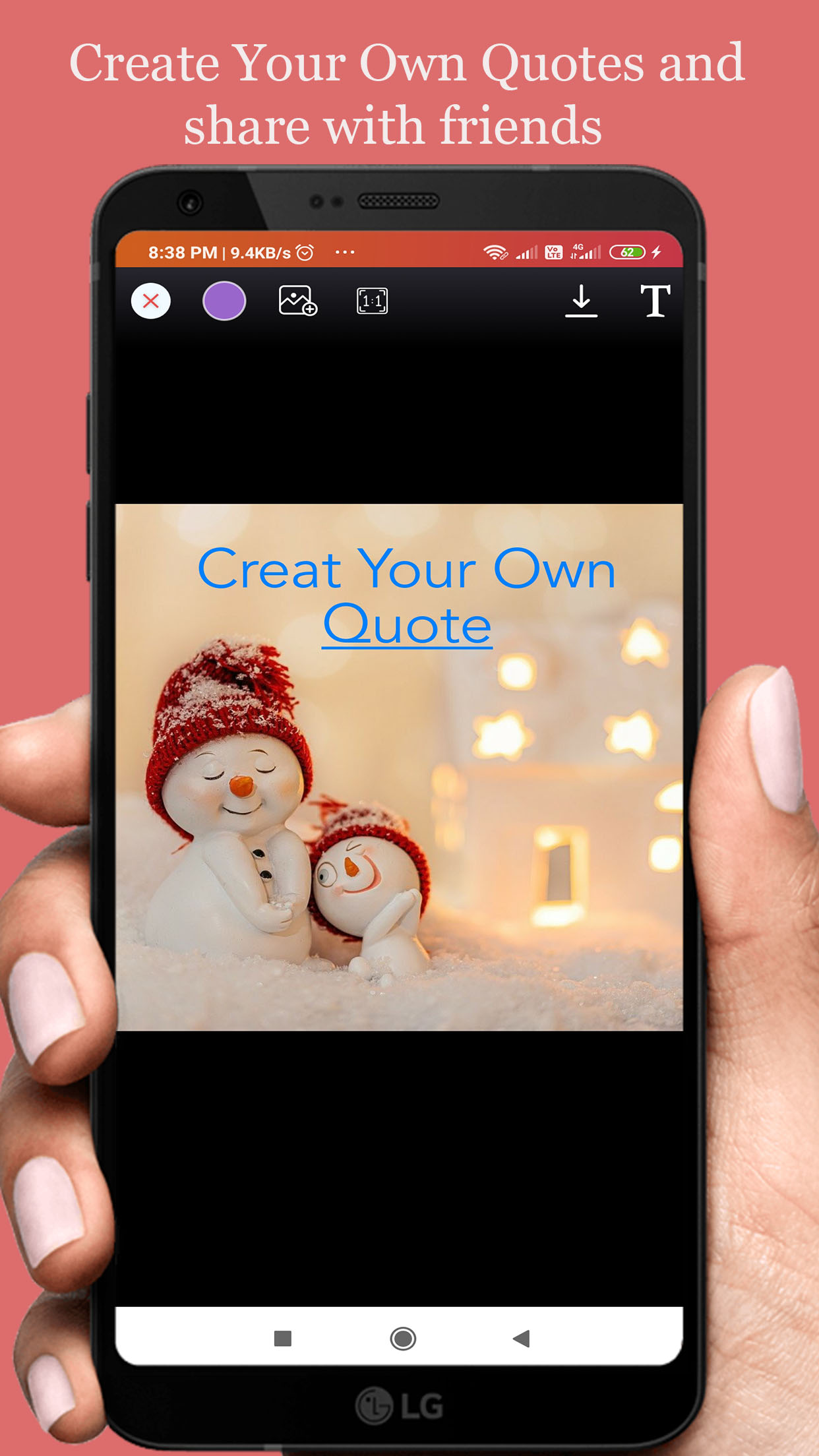 Large collection of Quotes on love, life, motivational, sport, Bollywood, etc., with beautiful design and excellent user interface (UI) that gives you one touch options for save, share and set wallpaper along with additional options for creating your own quotes.