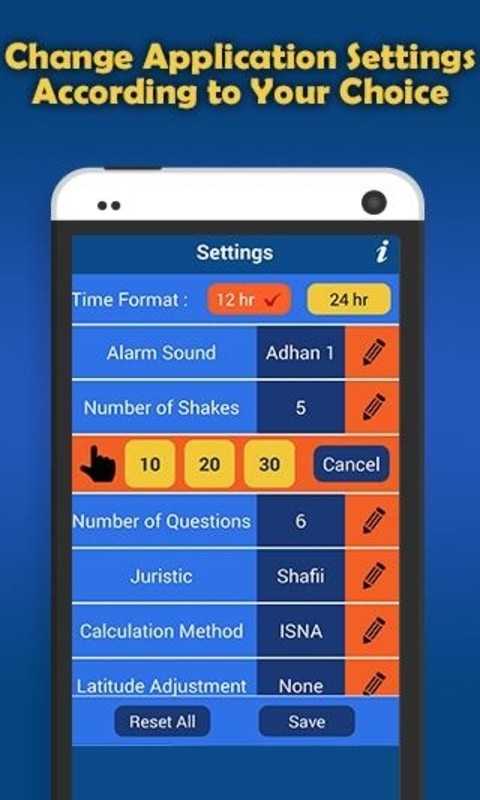 • Calculation Method of the time of Salah can be chosen from any of MWL, ISNA, Egypt, Makkah, Karachi, Tehran or Jafari.