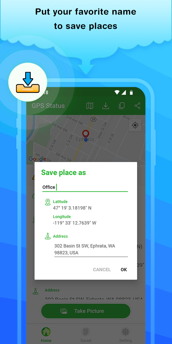 Enable GPS in Phone and get accurate GPS coordinates, not only that, you can save Location of places with custom names, and share your camera or Gallery Picture having GPS coordinates with Family & friends.