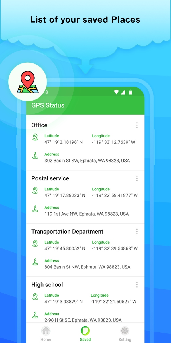 ✶ Save place having latitude longitude And Address in a list form, surprisingly, you can add custom names.