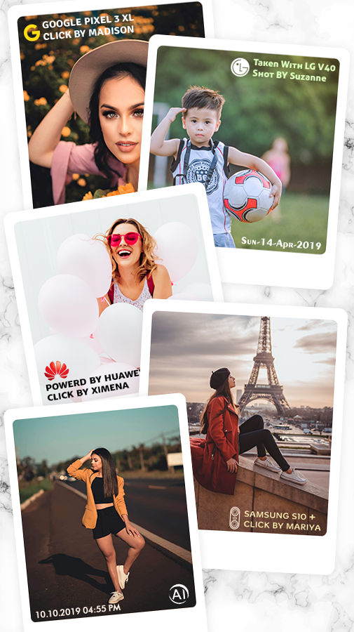 Purchased the latest smartphone? Doesn't have ShotOn highlight inbuilt? Relax! Download Shot On Stamp Photos with ShotOn Watermark Camera application and tweak these copyright labels. Benefit to add Shot On for Intex, ShotOn for Honor, and many others.