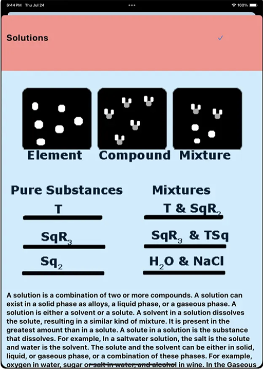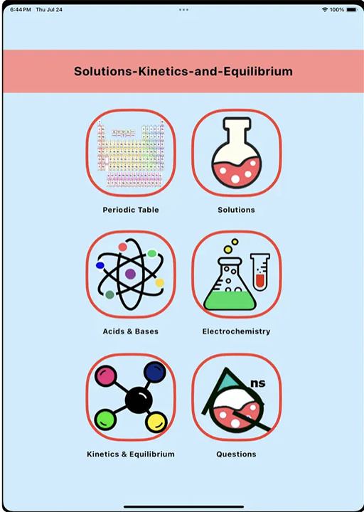 "Solutions-Kinetics-Acids" is an educational app or a reference app to learn about the topics - Solutions, Acids and Bases, Electrochemistry, and Kinetics. The app provides comprehensive details on the above-mentioned important topics in Chemistry. The app starts with a display of various elements in the Periodic Table, explains chemistry concepts on matter and their composition, and provides in-depth reference on the topic of Acids and bases. The app explains important laws in Electrochemistry and ends with a short quiz to check your knowledge or refresh the topics