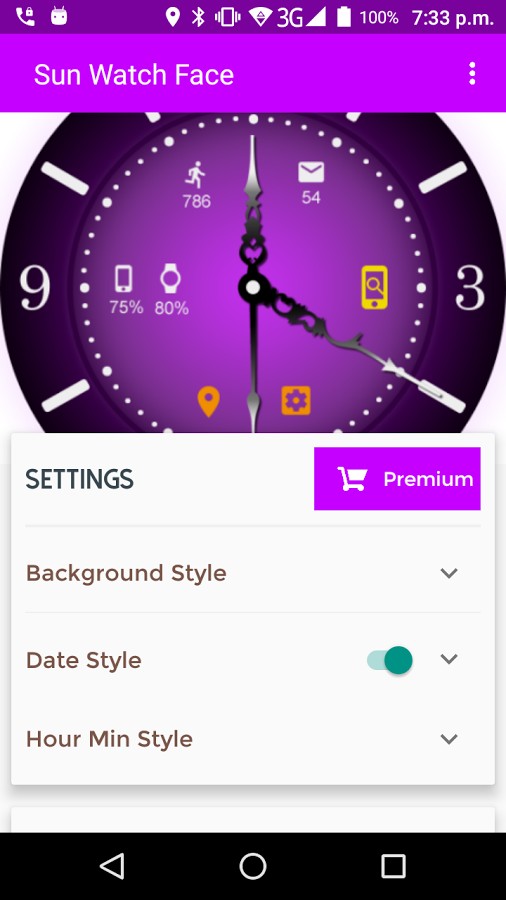 As this is the initial version of this unique Sun Watch Face android wear app, the whole settings will be managed from Phone App. You need to set Sun Watch Face app as your Watch face from Android Wear app on your phone.