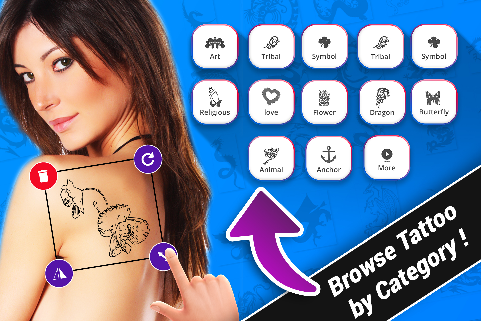 Tattoo Design : So many Tattoo Designs are available with this app. You can choose Tattoo Design from different type of Tattoo Categories (Art Tattoo Design, Tribal Tattoo Design, Religious Tattoo Design, Love Tattoo Design, Flower Tattoo Design, Dragon Tattoo Design, Butterfly Tattoo Design, Animal Tattoo Design & Anchor Tattoo Design)