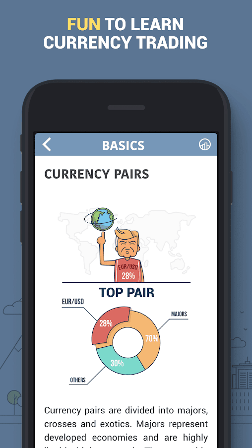 The Trading game is a professional Forex, Stock, Commodities and Cryptocurrency real-time trading simulator. It’s completely free and without any annoying ads and sign-ups. Full of fun illustrations, pro-trading tips and features that excites even experienced traders. The app is a great learning tool, because it contains a trading university for every trader to supplement their trading skills and practice them in the real-time trading simulator. Trading lessons include topics such as why to trade forex, the basics of currency trading and how to read price charts and, of course, tips and tricks form professional traders.