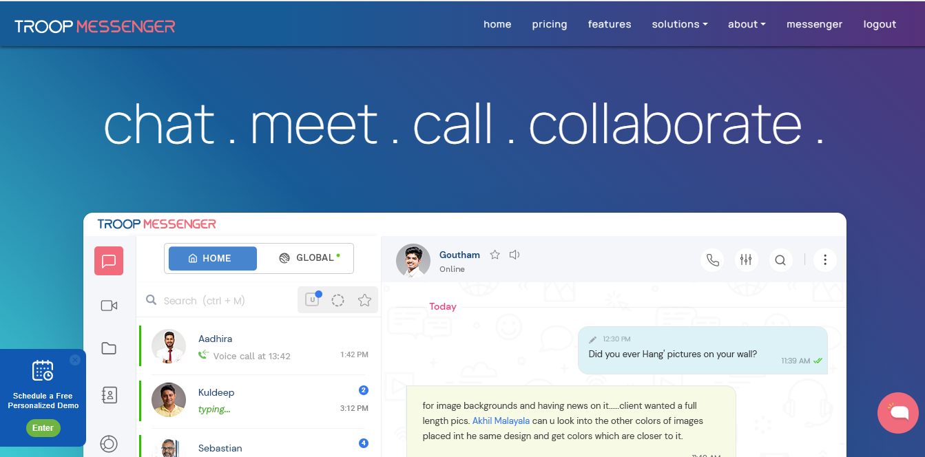 Troop Messenger allows office teams from all departments to collaborate from anywhere, at any time. Its immediate chat, calls, conferences, meetings, and other work efficiency aspects make it a popular platform for sharing business communications.