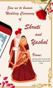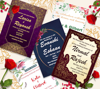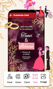 On app of wedding card maker on wedding card designing app, variety of wedding invitation templates and empty wedding card samples are available. Who is interested to make card of wedding invites or personalized cards wedding card designing app make affordable wedding invitations. Select wedding card sample of latest design from wedding card maker app. Then write name on wedding card of couple whose marriage ceremony is going to be held. Then save the date and wedding venue on certain wedding invitation templates. Further, you can place images or stickers on certain picture place. You can write wedding venue, name of couple with elegant style. Save all certain text and picture on wedding invitation templates you selected.