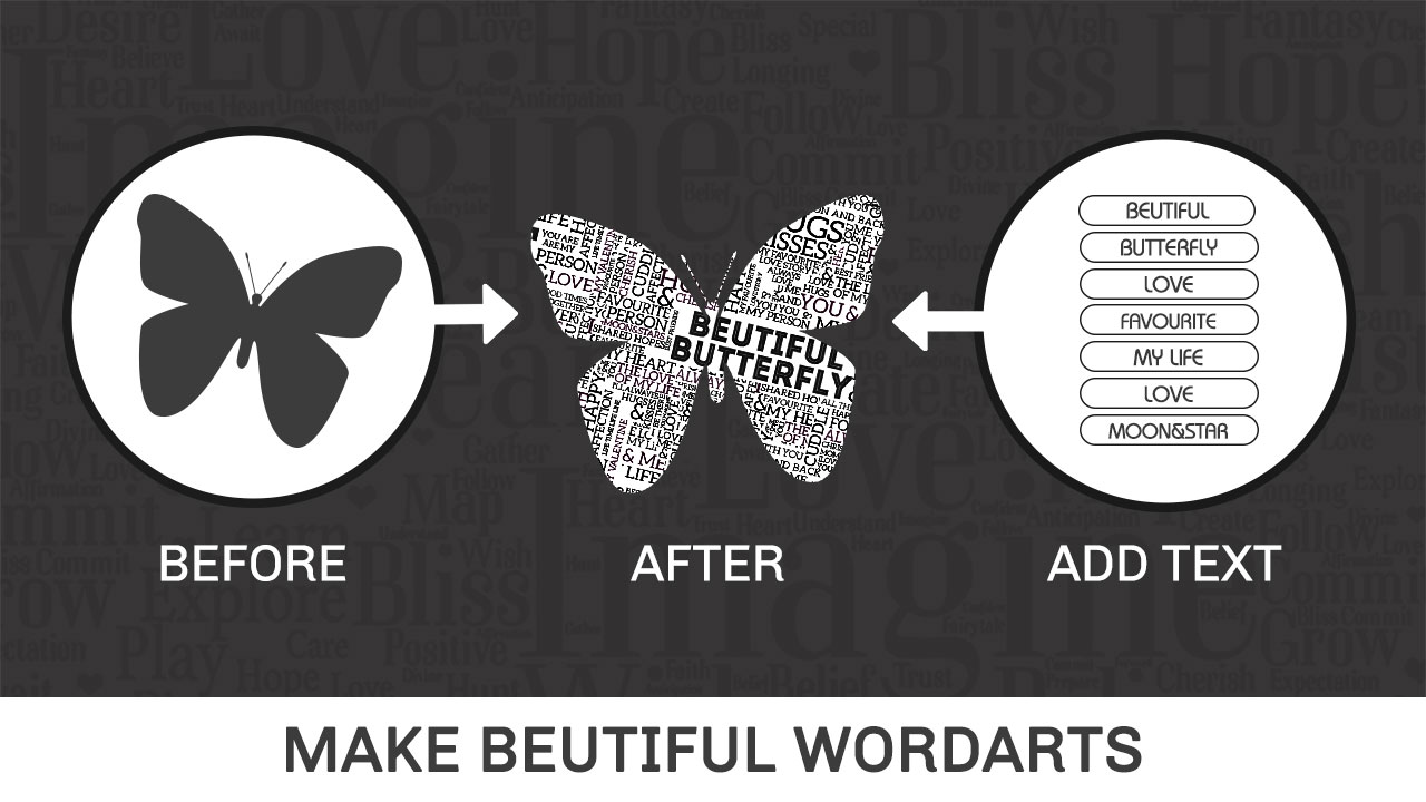 Word Art Creator - Word Cloud Generator created for making beautiful word clouds that put your words into shapes. Word cloud has a dedicated store for shapes, with more shape categories. Word cloud app maker is super customizable with different fonts, colors and word layouts. This app will generate word cloud collage with randomly picked words and apply the color of the pallet selected, and arrange words to fit in an image or shape. You don't need to worry about arranging each word with different fonts and colors because free word cloud generator is efficient in choosing the right color and font combination for maximum visibility of each word. The app will provide a unique font style, and colors to choose from.