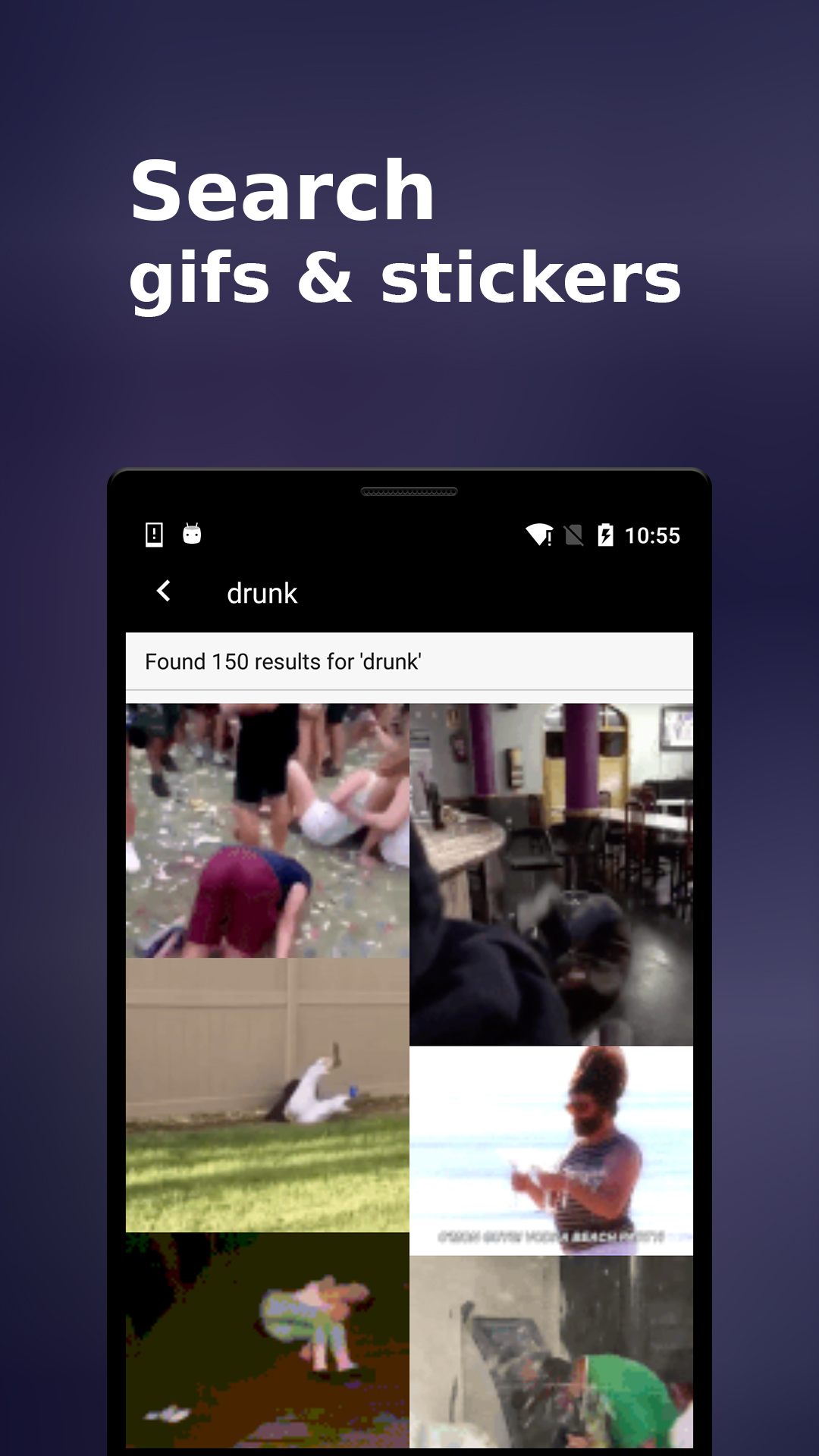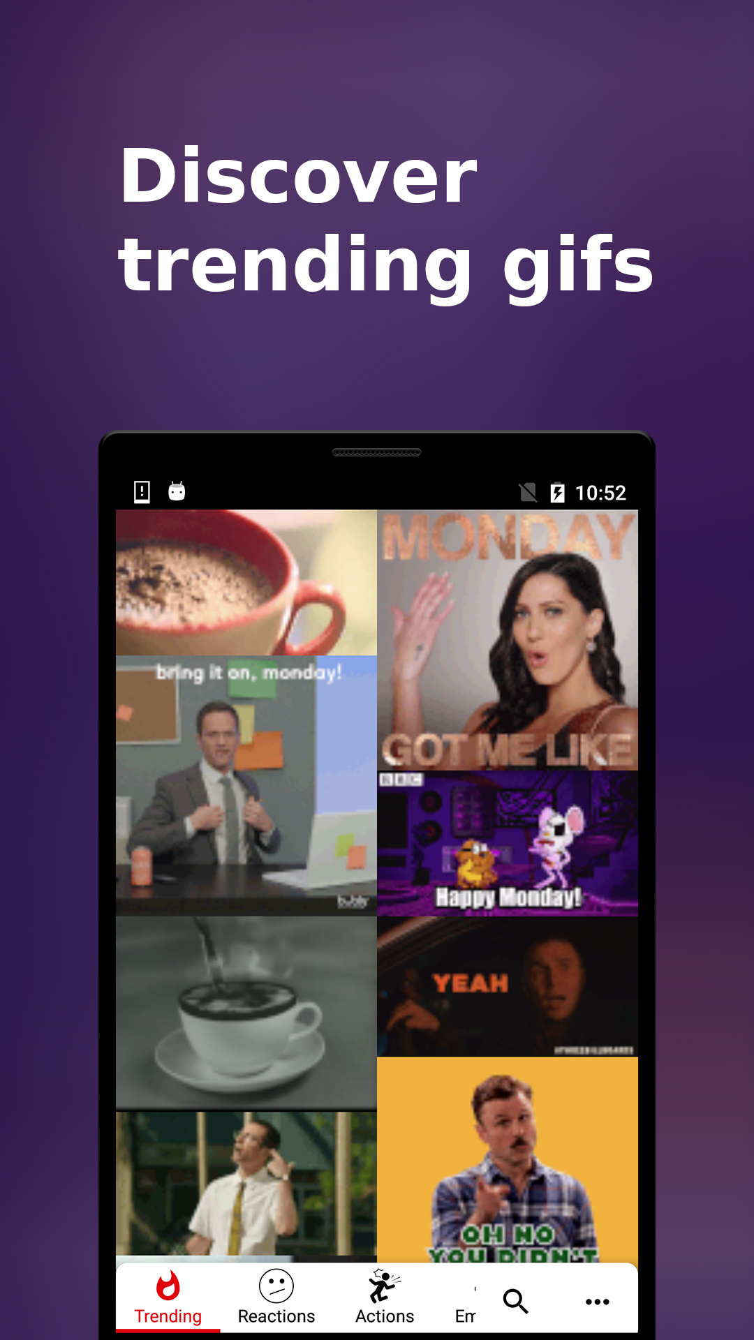 • Explore gifs from many topics (reactions, actions, memes, tv, stickers...)