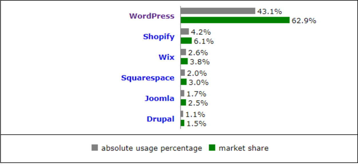 The platform’s usage statistics are the major evidence of its popularity among people. As per the W3Techs report, WordPress powers 43.1% of websites on the internet and has a high market share of 62.9%, the highest among other CMSs.